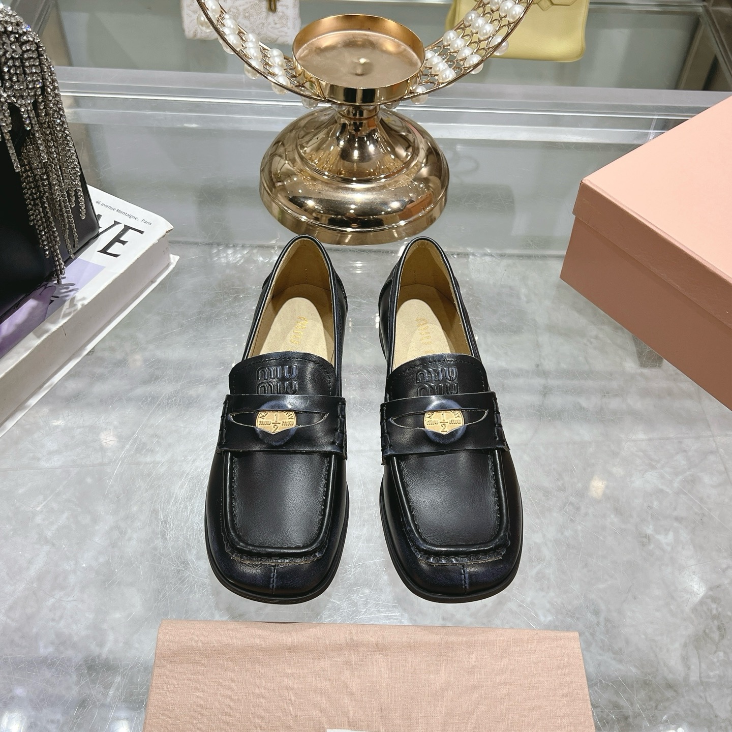 The standout detail — a gold-tone coin plaque embedded across the strap — adds a vintage-inspired touch, subtly engraved with the Miu Miu logo for an elevated finish. An embossed logo on the tongue completes the look, while the leather lining and low stacked heel ensure day-long comfort.