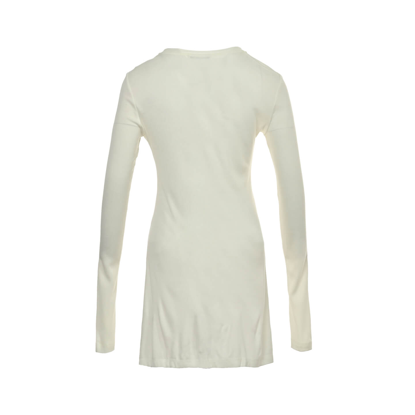 Experience refined comfort with this ivory long-sleeve mini t-shirt dress. Crafted from a uniquely dyed fabric, it boasts a luxurious, high-end feel achieved through a light wash and subtle sanding, perfect for effortless elegance.