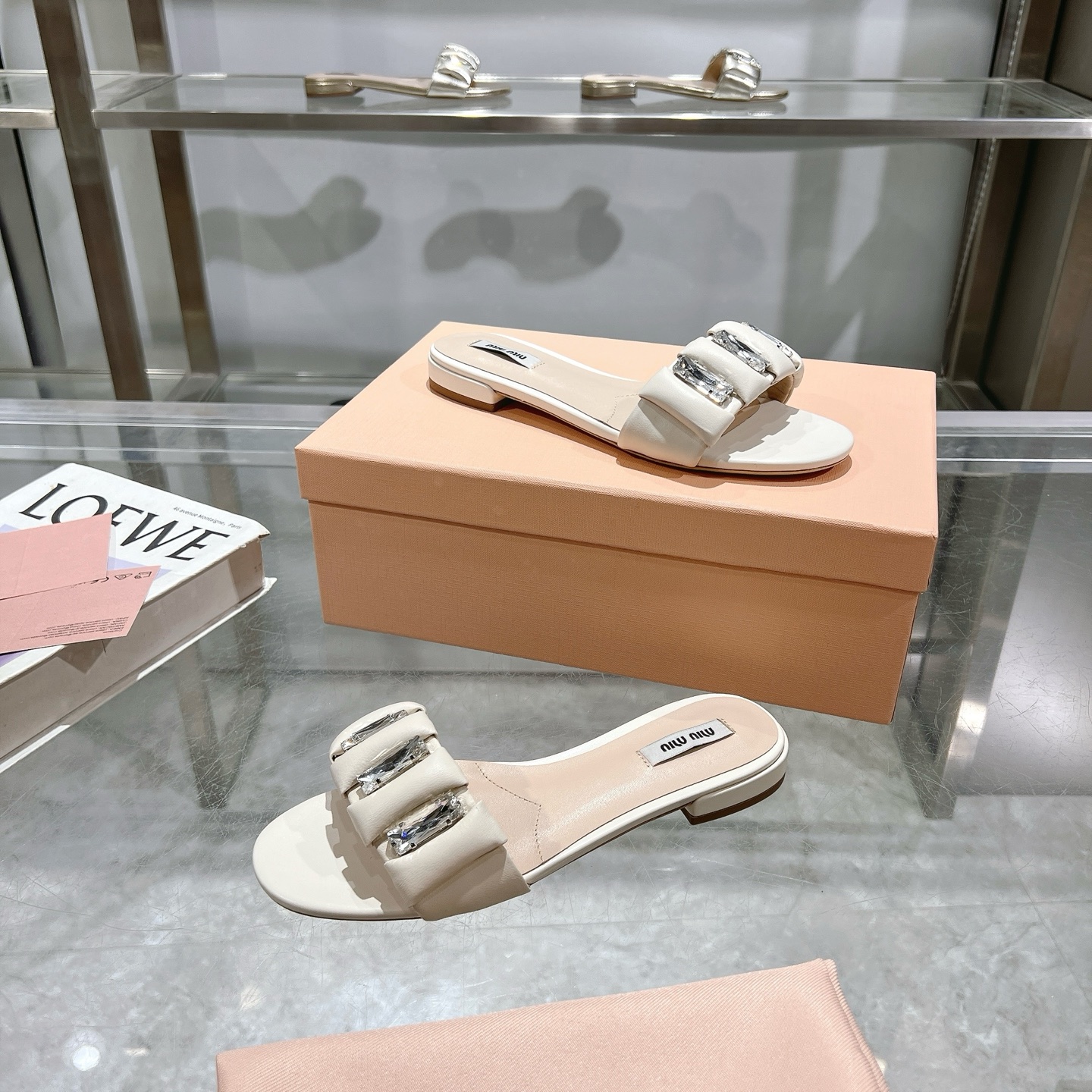 These Miu Miu slide sandals bring a refined sparkle to laid-back elegance. Crafted in supple ivory leather, the square-toe design features a sleek flat silhouette with a padded footbed for added comfort. The upper strap is elevated by three oversized rectangular crystals, set into soft ruched leather bands that add dimension and luxury.