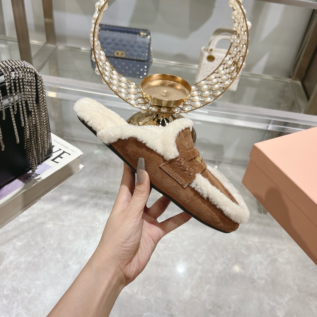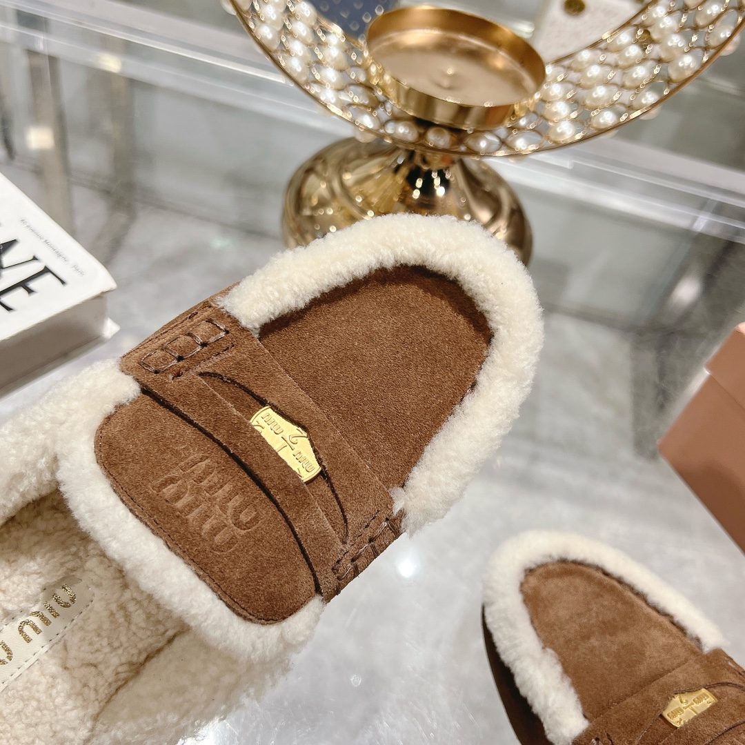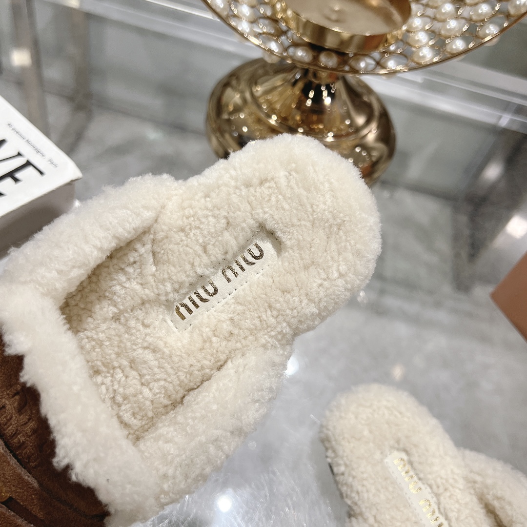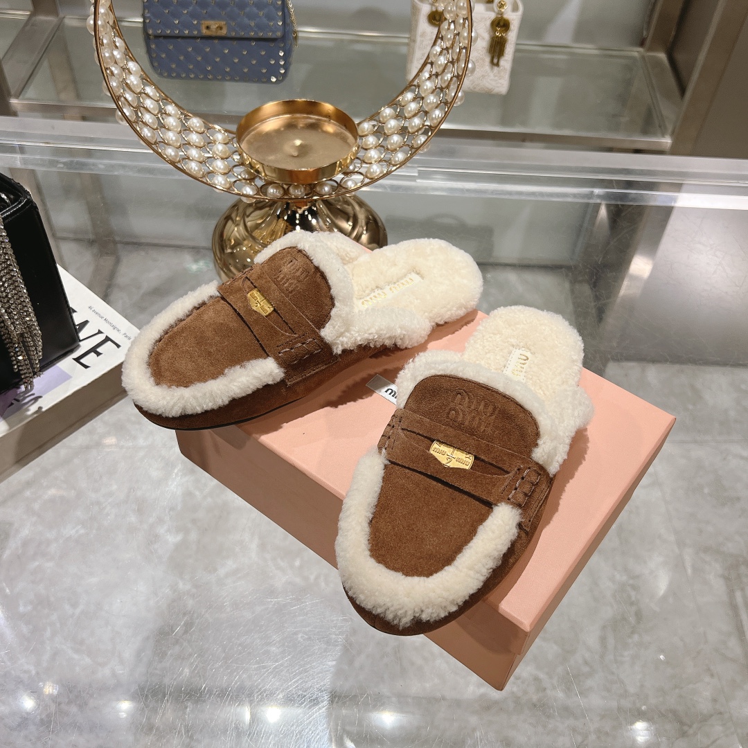 These luxurious Miu Miu slippers feature soft, plush fur lining and rich dark brown suede uppers, offering both comfort and style.