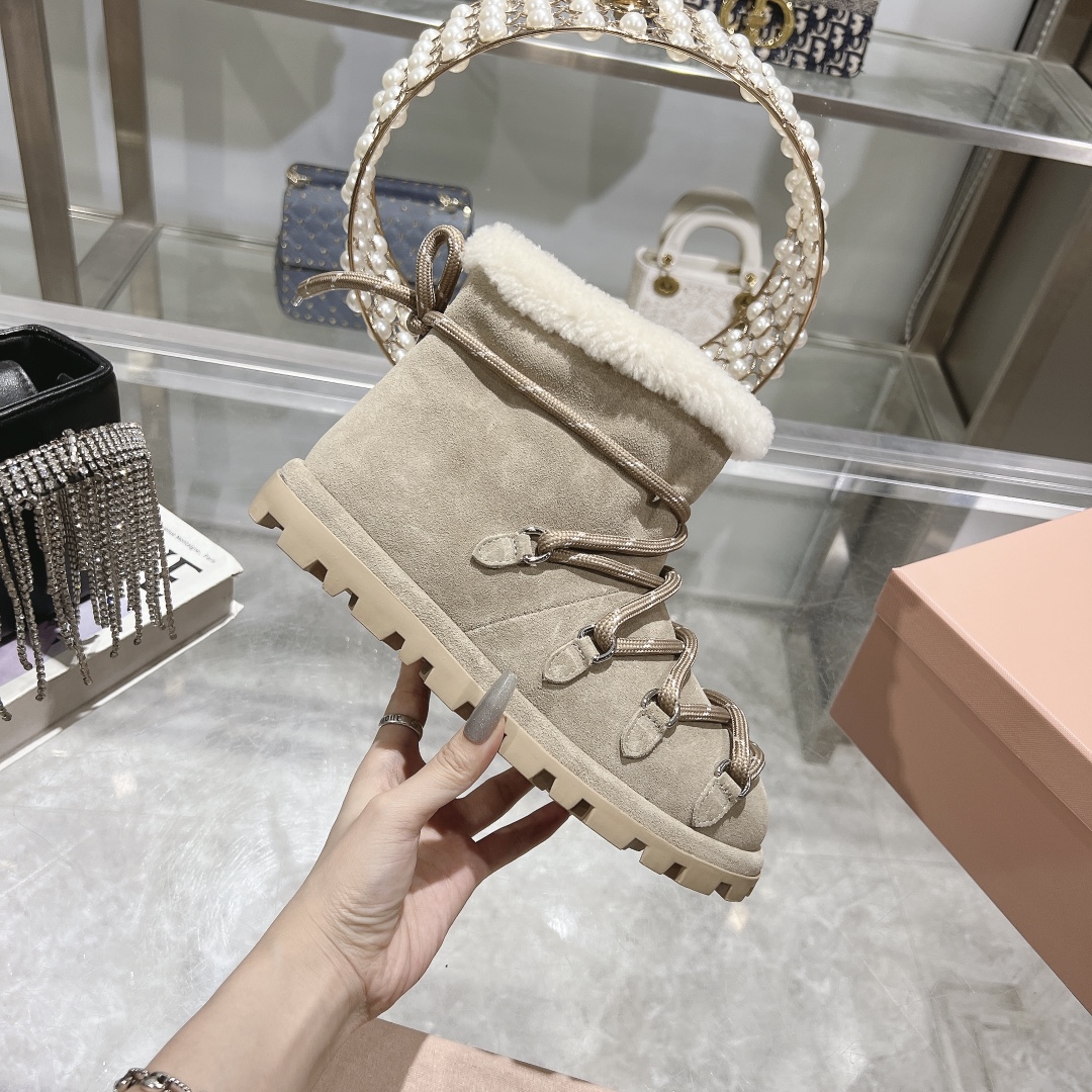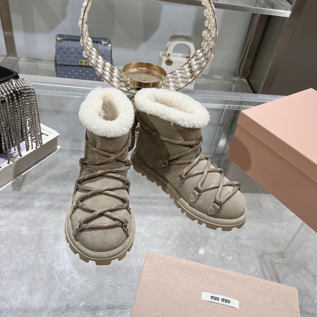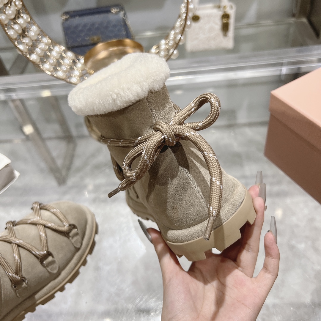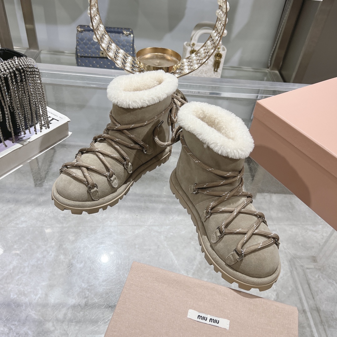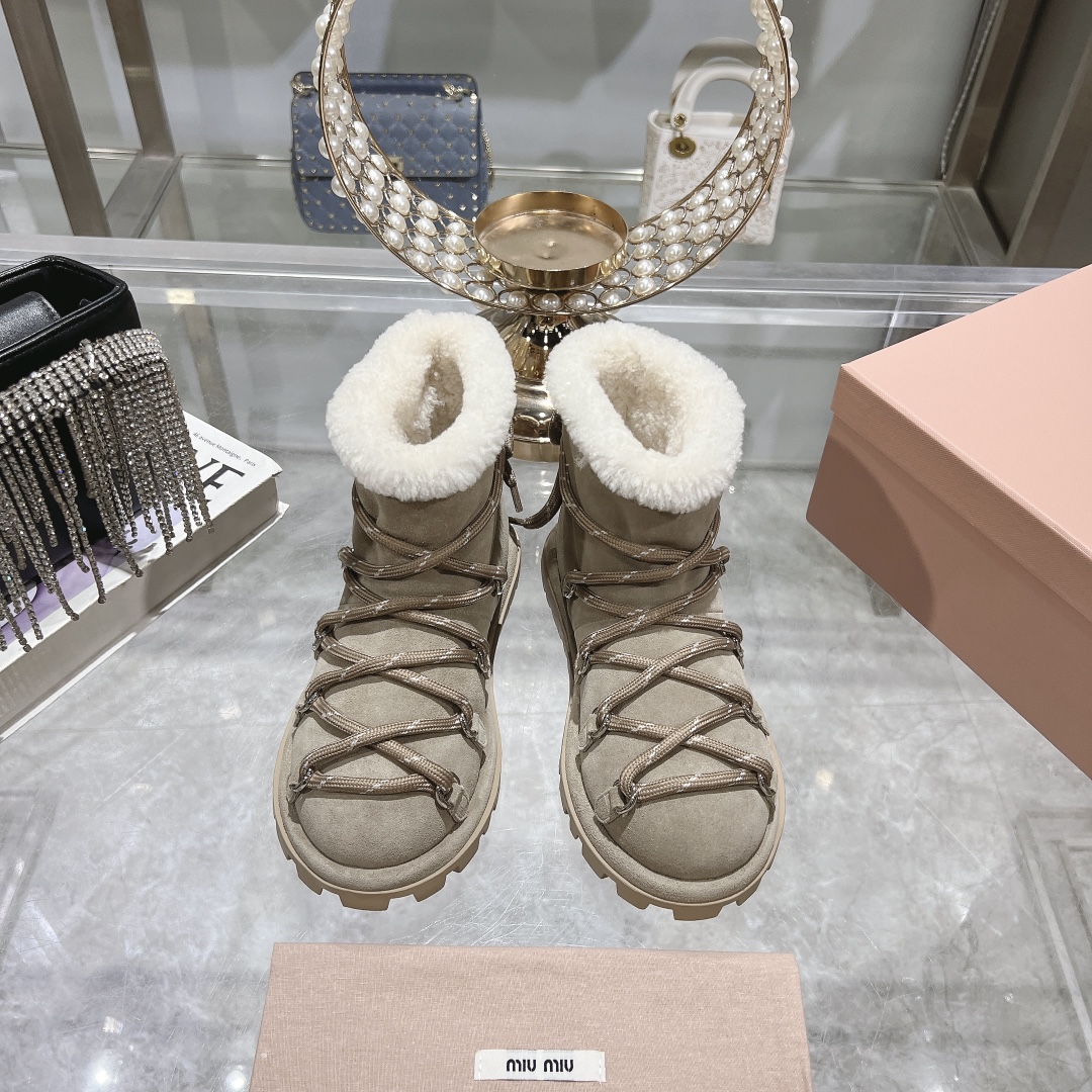 The rubber lug sole offers superior traction, ideal for winter conditions. A round toe and a mid-height ankle cut enhance comfort, while the signature Miu Miu logo tab on the side lends a touch of elegance.