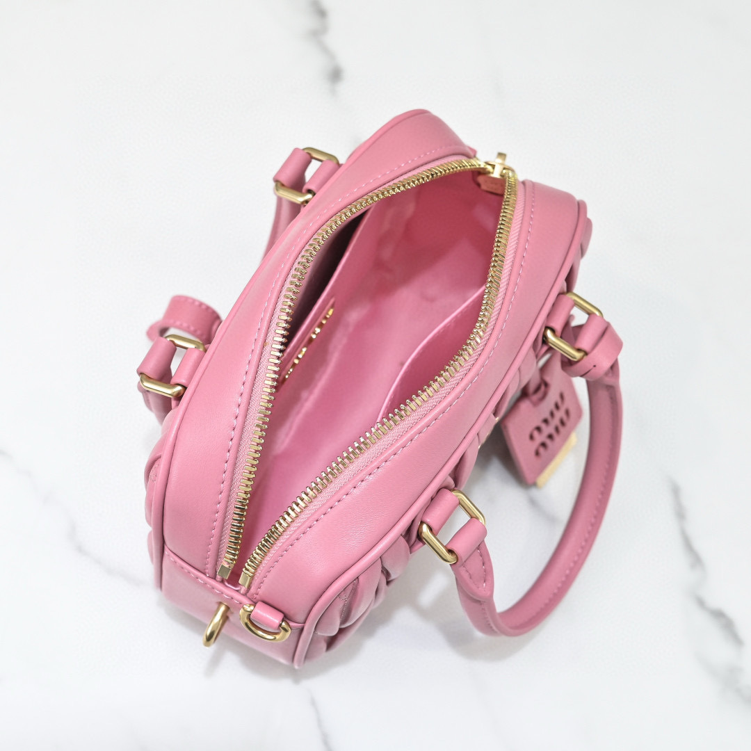 Add a touch of elegance to your look with this Miu Miu Pink Matelassé Mini Top Handle Bag, crafted in Italy from soft lambskin leather.