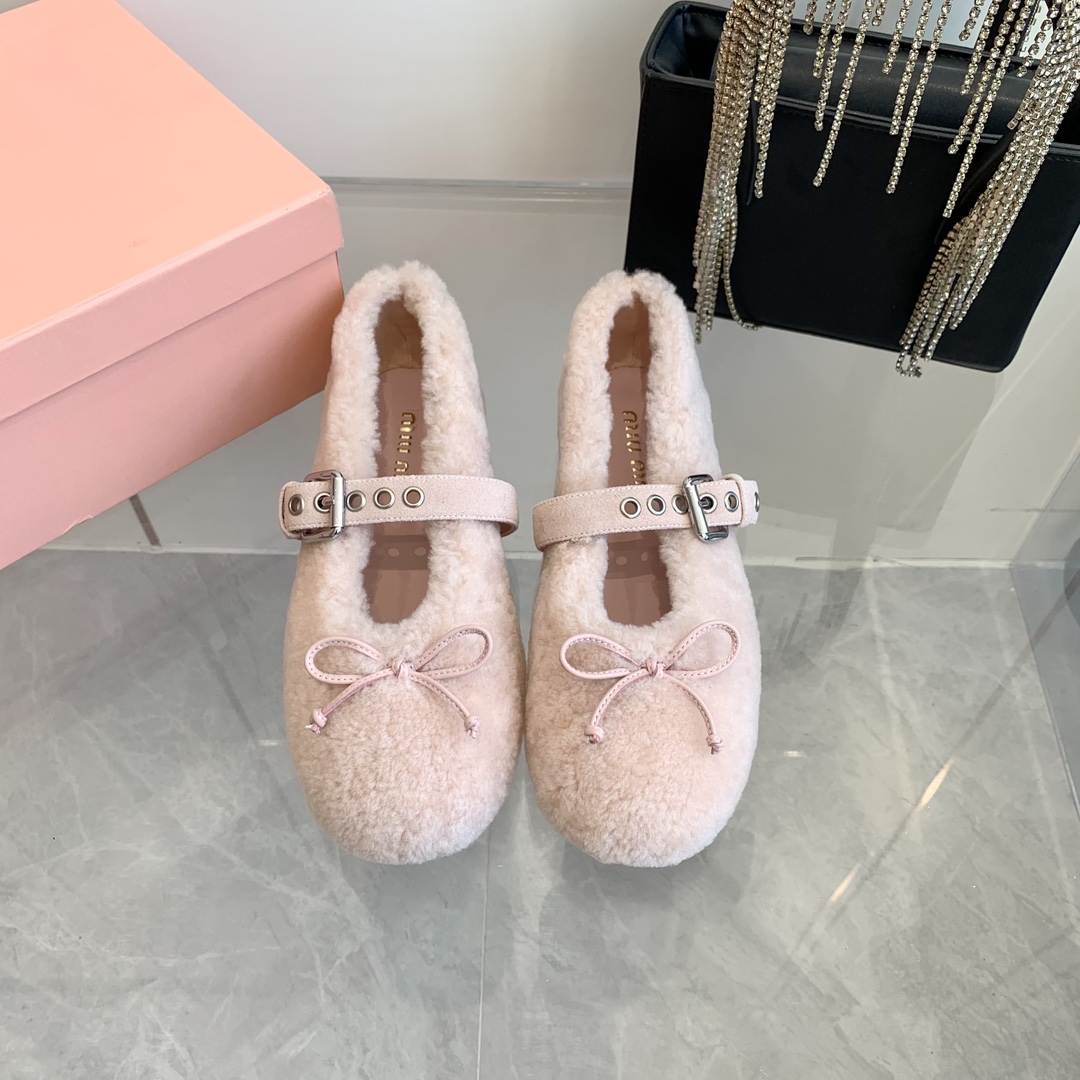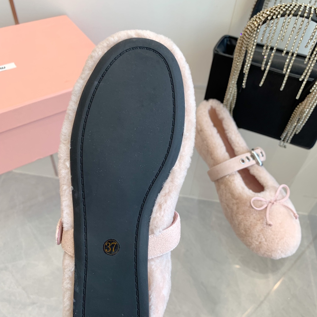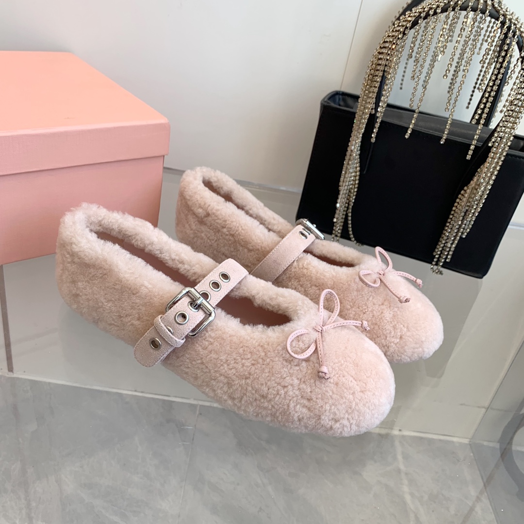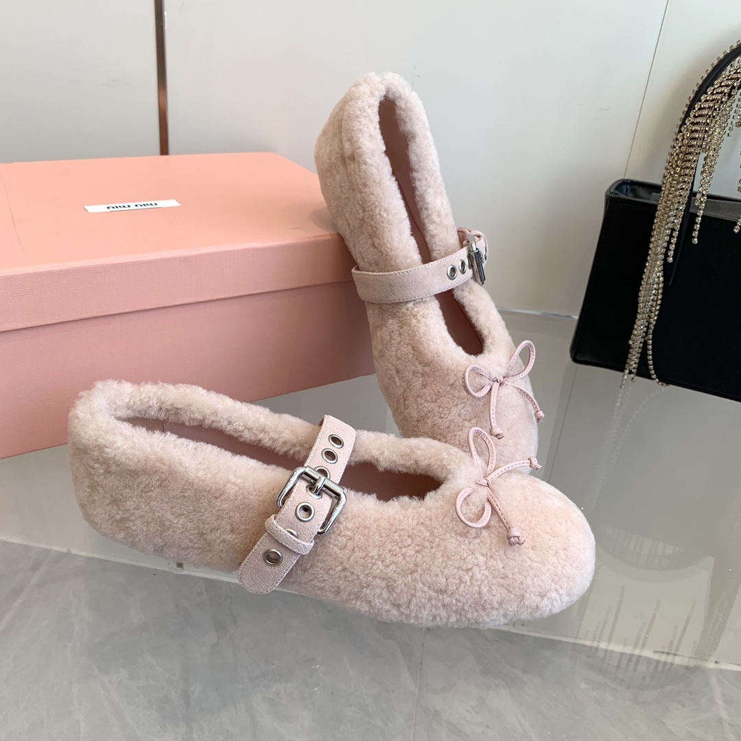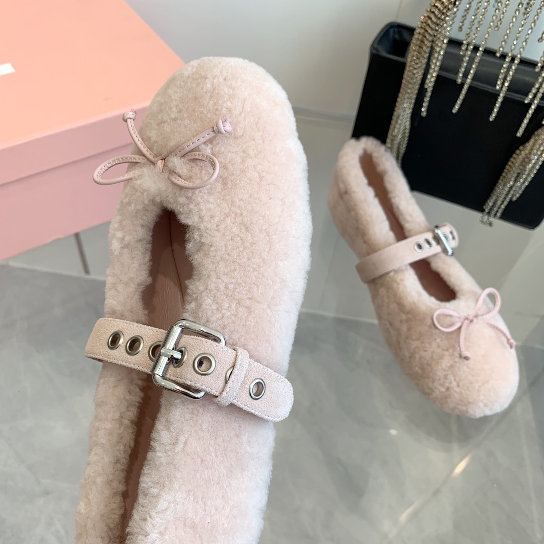 These Miu Miu ballerinas feature a soft, plush shearling exterior in a delicate pink hue, offering both warmth and elegance.