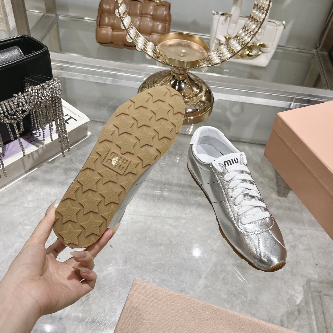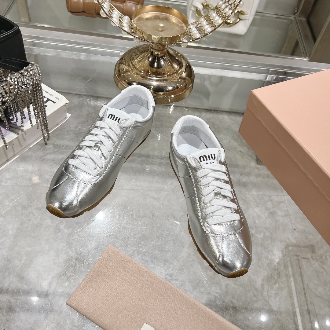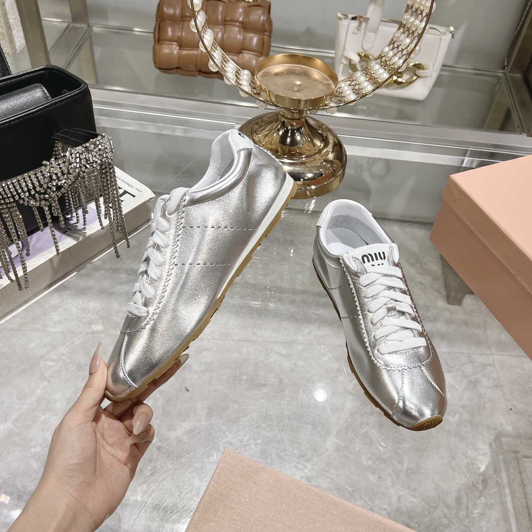 The Miu Miu Plume Silver Sneakers are a stylish fusion of luxury and sporty elegance, crafted from premium metallic leather with soft cotton lining for comfort.