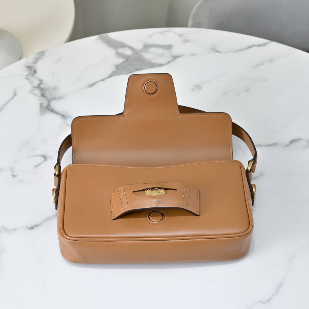 The Miu Miu Tan Leather Flap Shoulder Bag exudes timeless elegance with a touch of modern sophistication. Crafted in Italy from smooth tan leather, it features a structured silhouette enhanced by a front flap with embossed logo detailing and a signature gold-tone push-lock clasp.