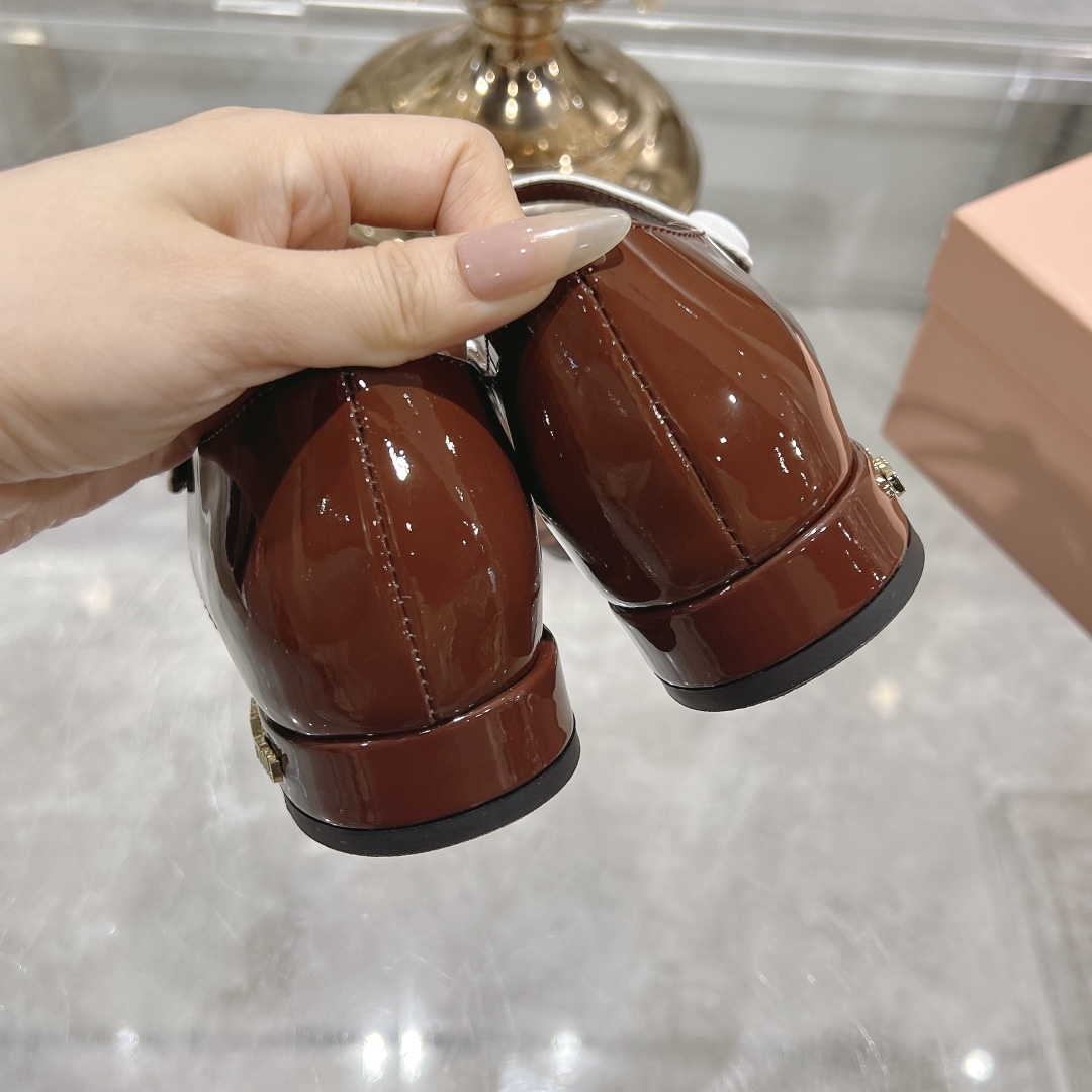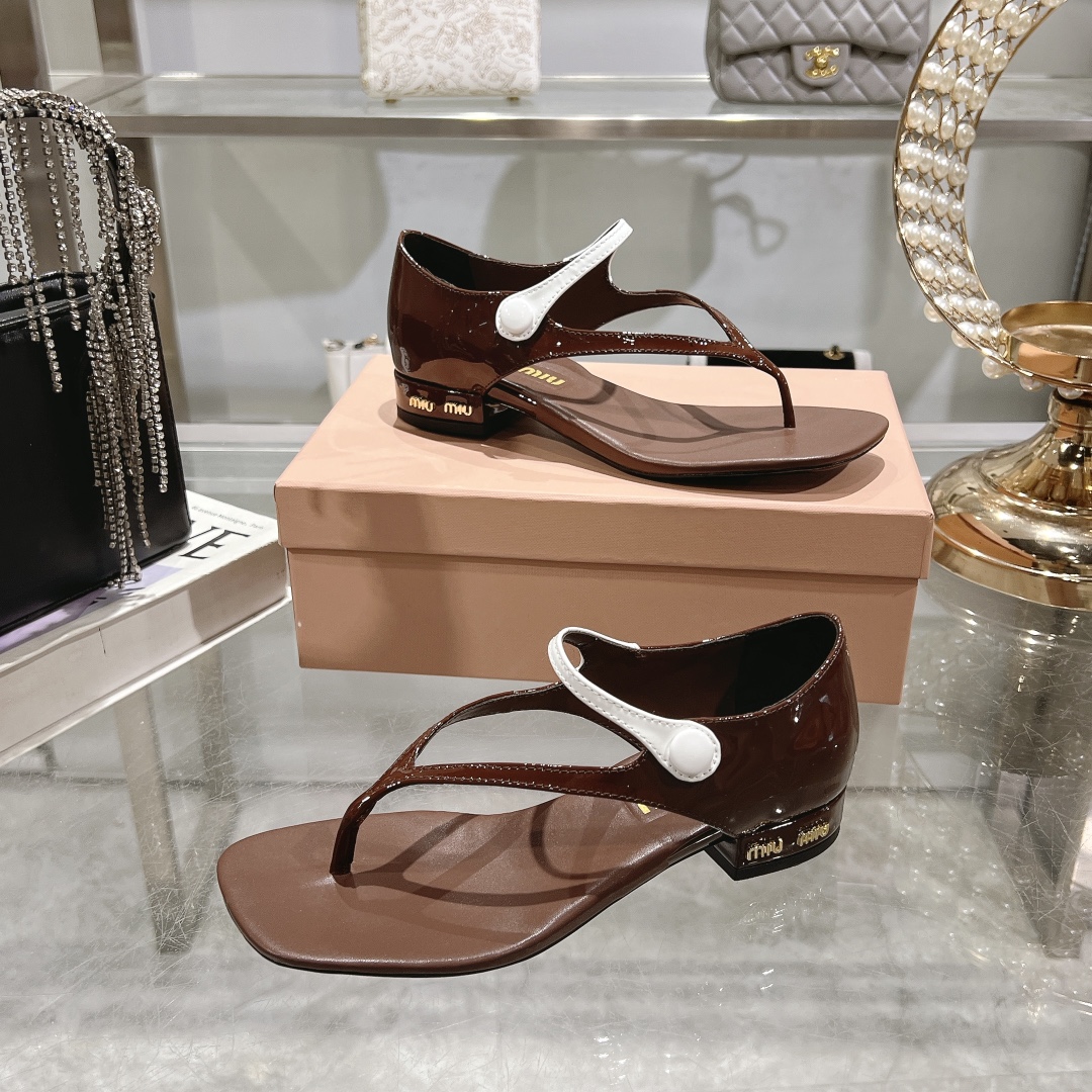 Elevate your summer wardrobe with these elegant two-tone Mary Jane thong sandals by Miu Miu. Crafted from glossy patent calfskin, they feature a rich brown body accented by a contrasting white buttoned strap.