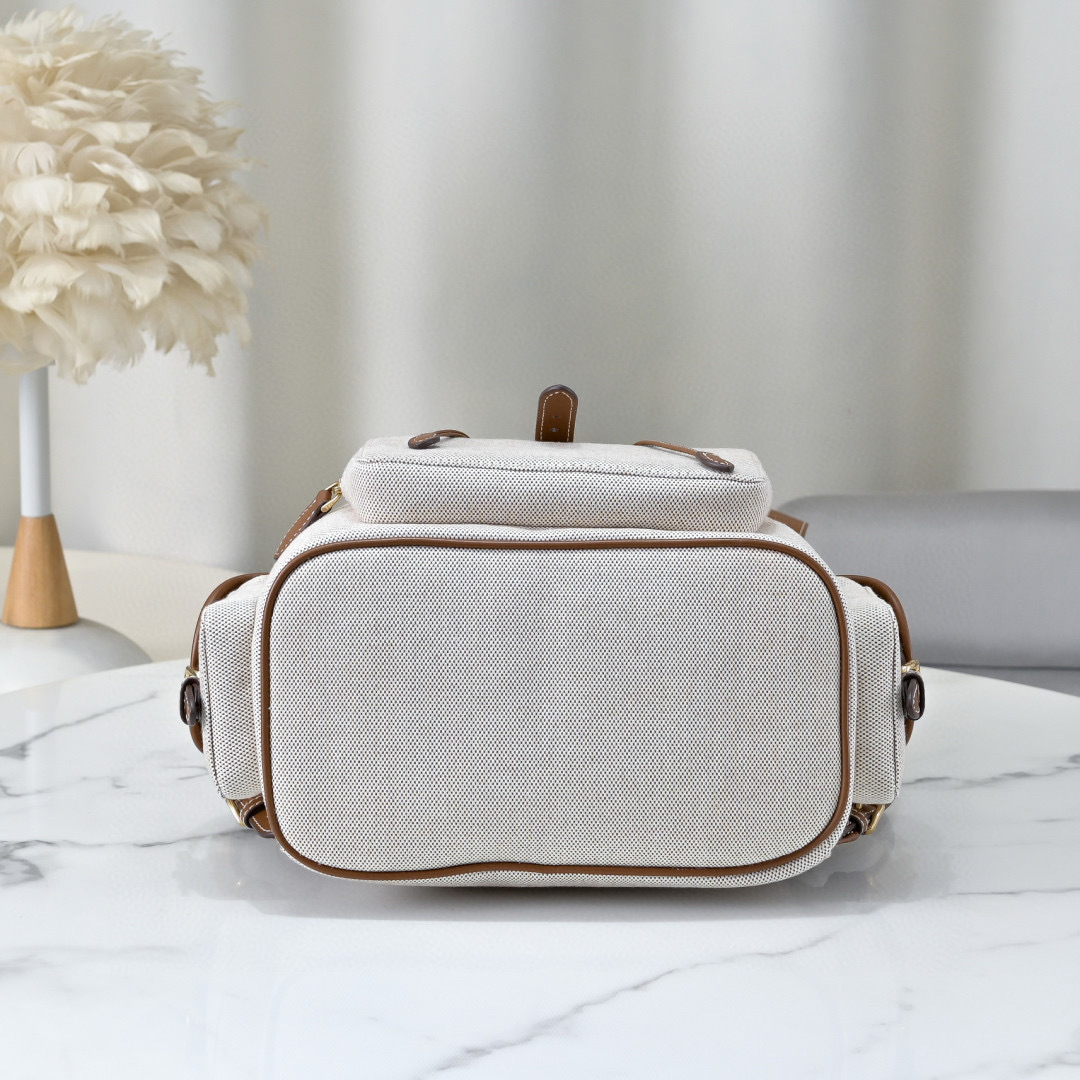 Crafted from durable white canvas with tan leather accents, it features a structured silhouette accented by the signature embossed Miu Miu logo on the flap. The adjustable leather straps ensure comfort, while multiple exterior pockets with buckle and zip closures offer added practicality.