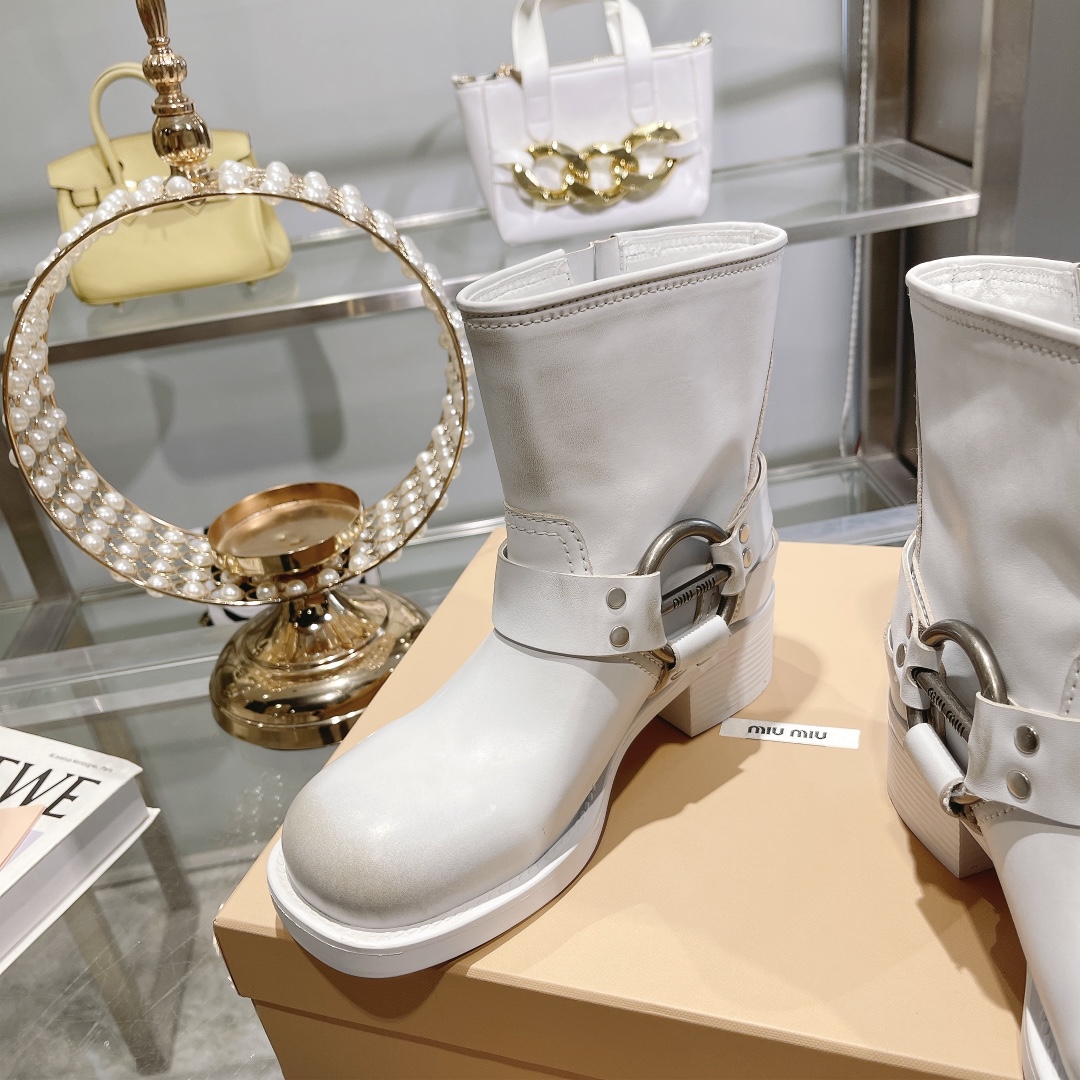 Unleash standout sophistication with these authentic Miu Miu white leather biker boots, a true fusion of Italian craftsmanship and runway-edge style.