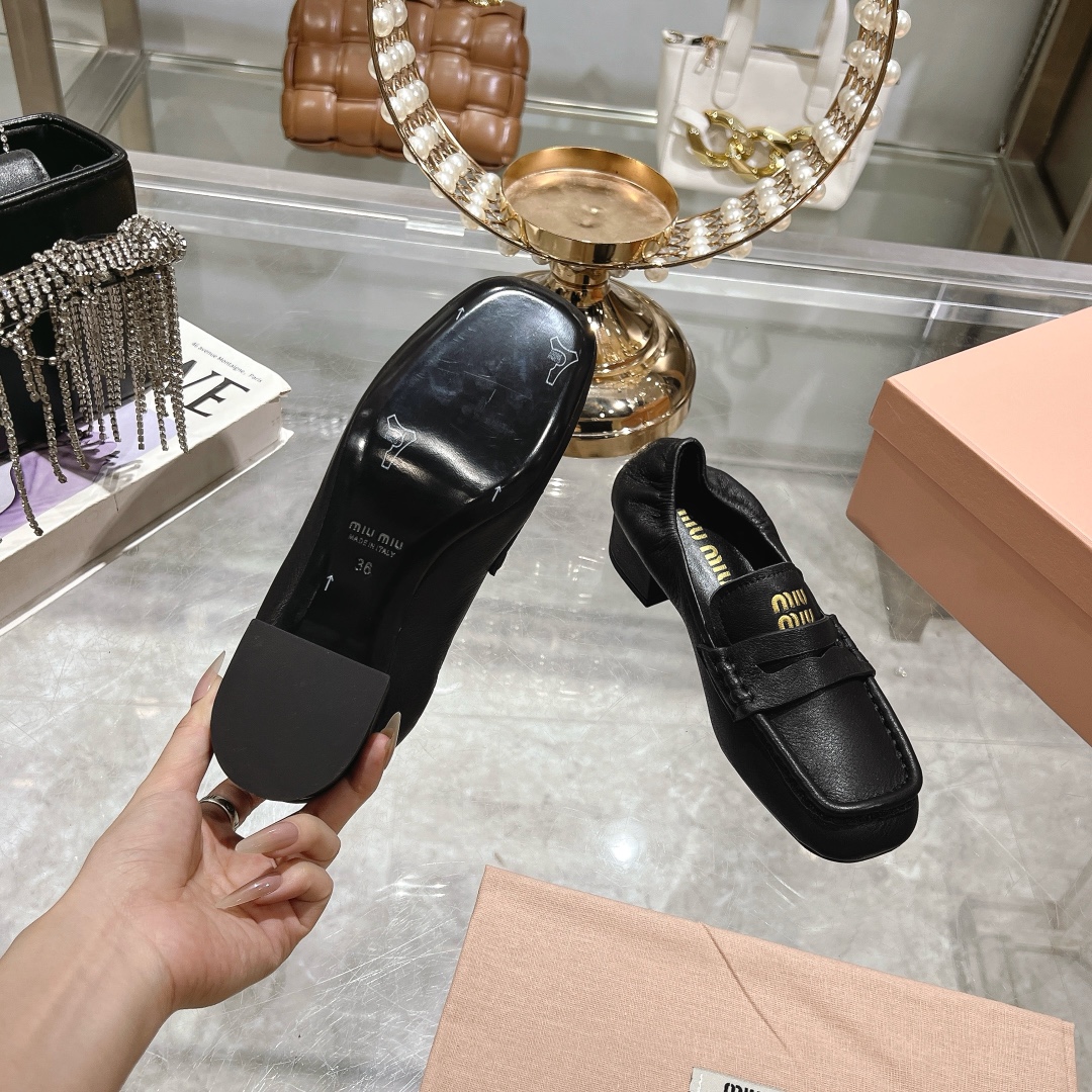 The shoes feature a gold-tone Miu Miu logo on the strap, subtly emphasizing the brand’s luxury appeal.