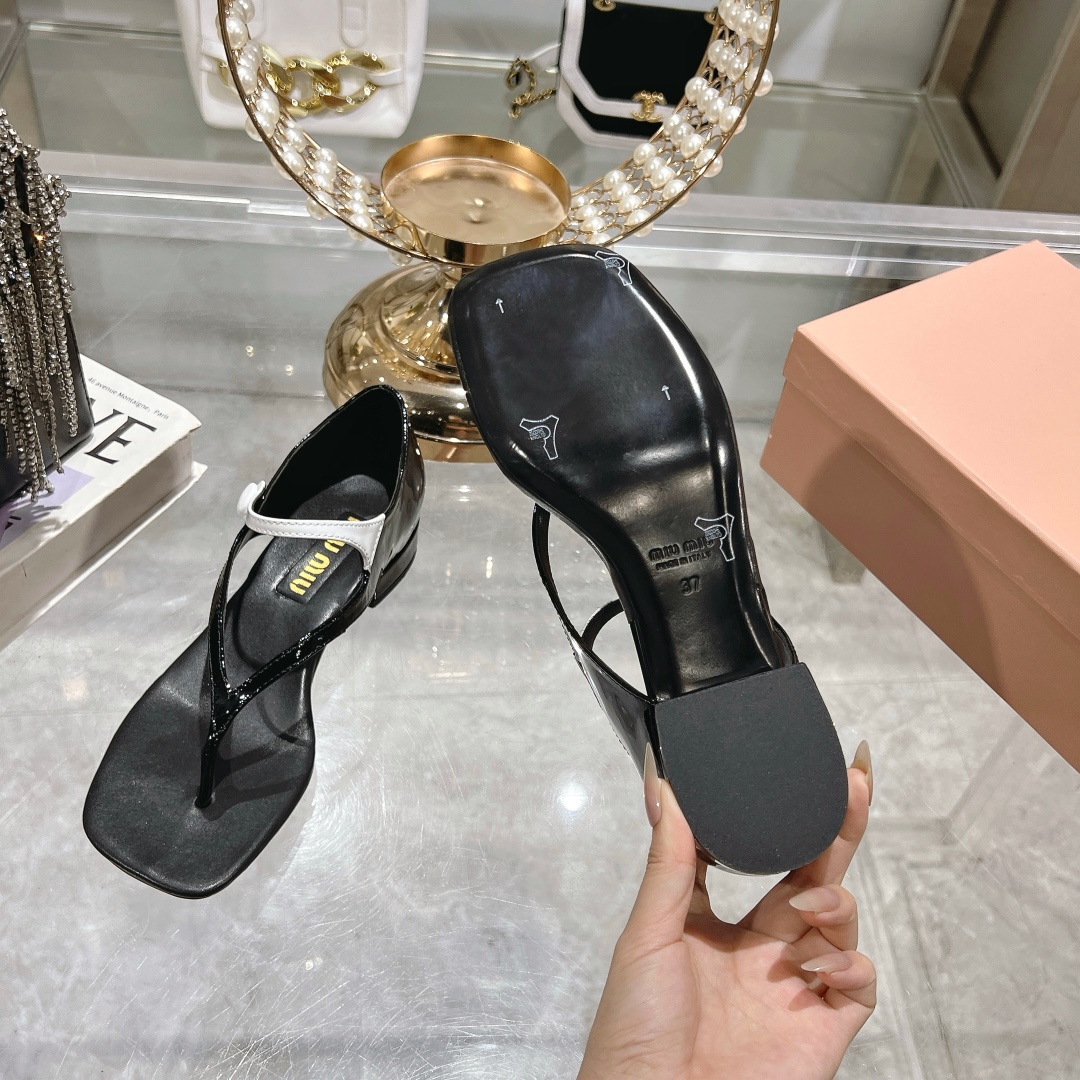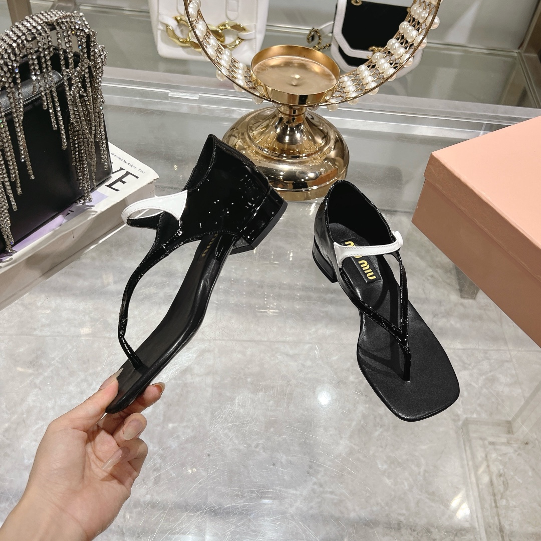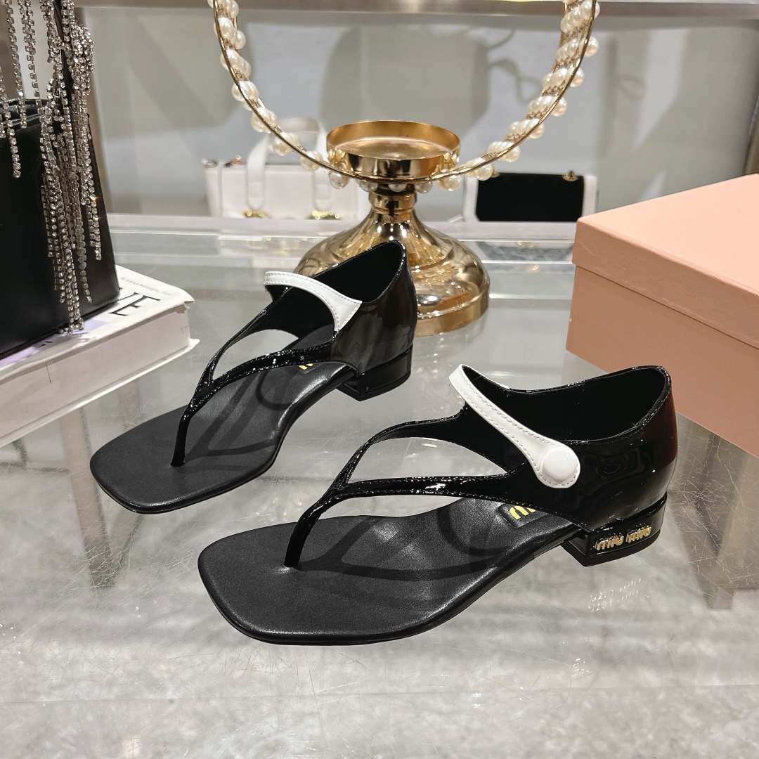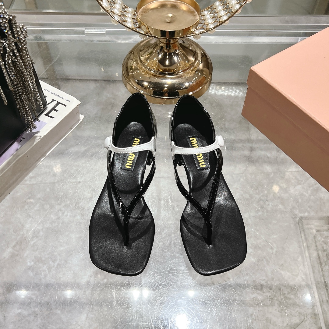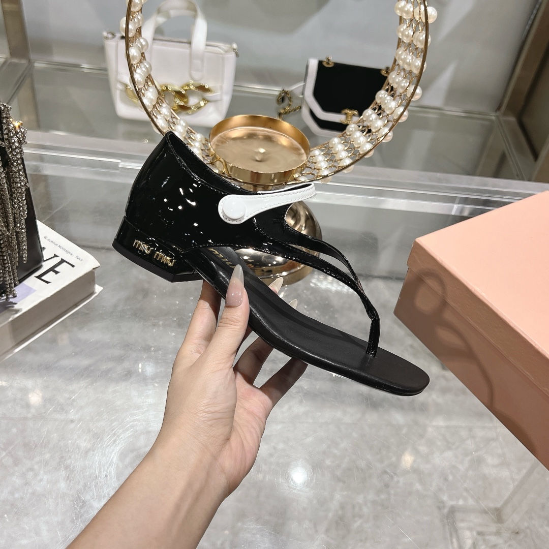 Inspired by the timeless Mary Jane, these Miu Miu thong sandals reimagine a classic icon with a modern twist. Crafted from soft, glossy calfskin, they feature an elegant strap with a covered button detail. A sleek leather sole ensures both comfort and sophistication.