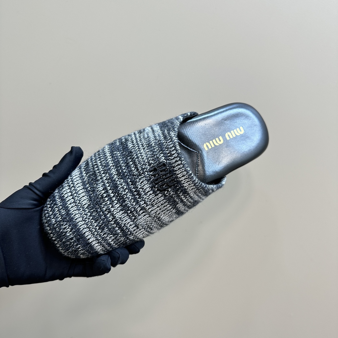 Looking for the perfect blend of comfort and style? The Miu Miu Navy blue Knit Wool Slippers are crafted from soft, upcycled wool for a cozy, breathable feel. Their black mélange pattern offers a versatile, sophisticated look.