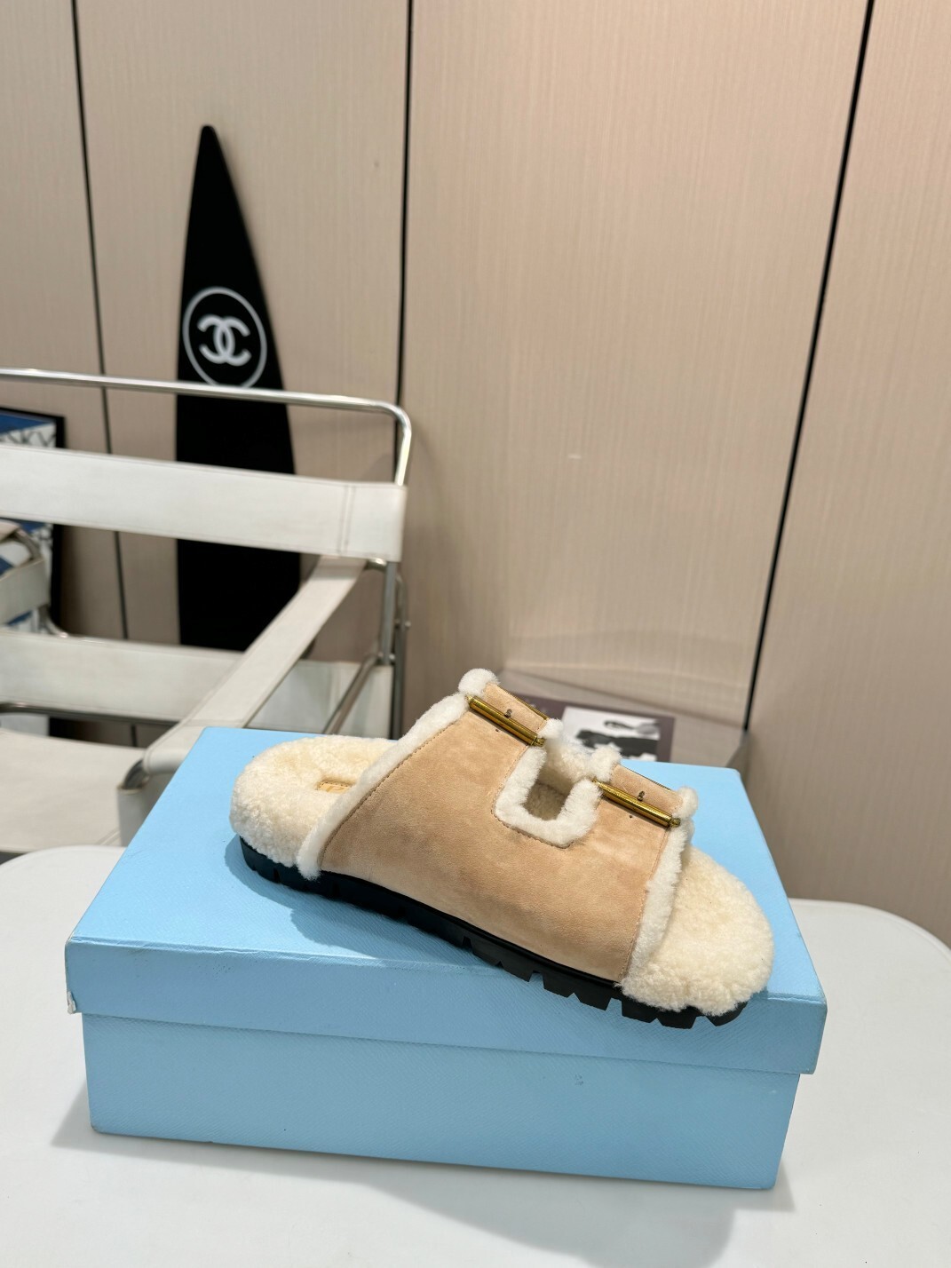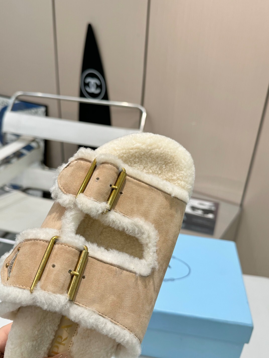 Perfect for transitional seasons, these Prada sandals elevate everyday looks with cozy-chic appeal.