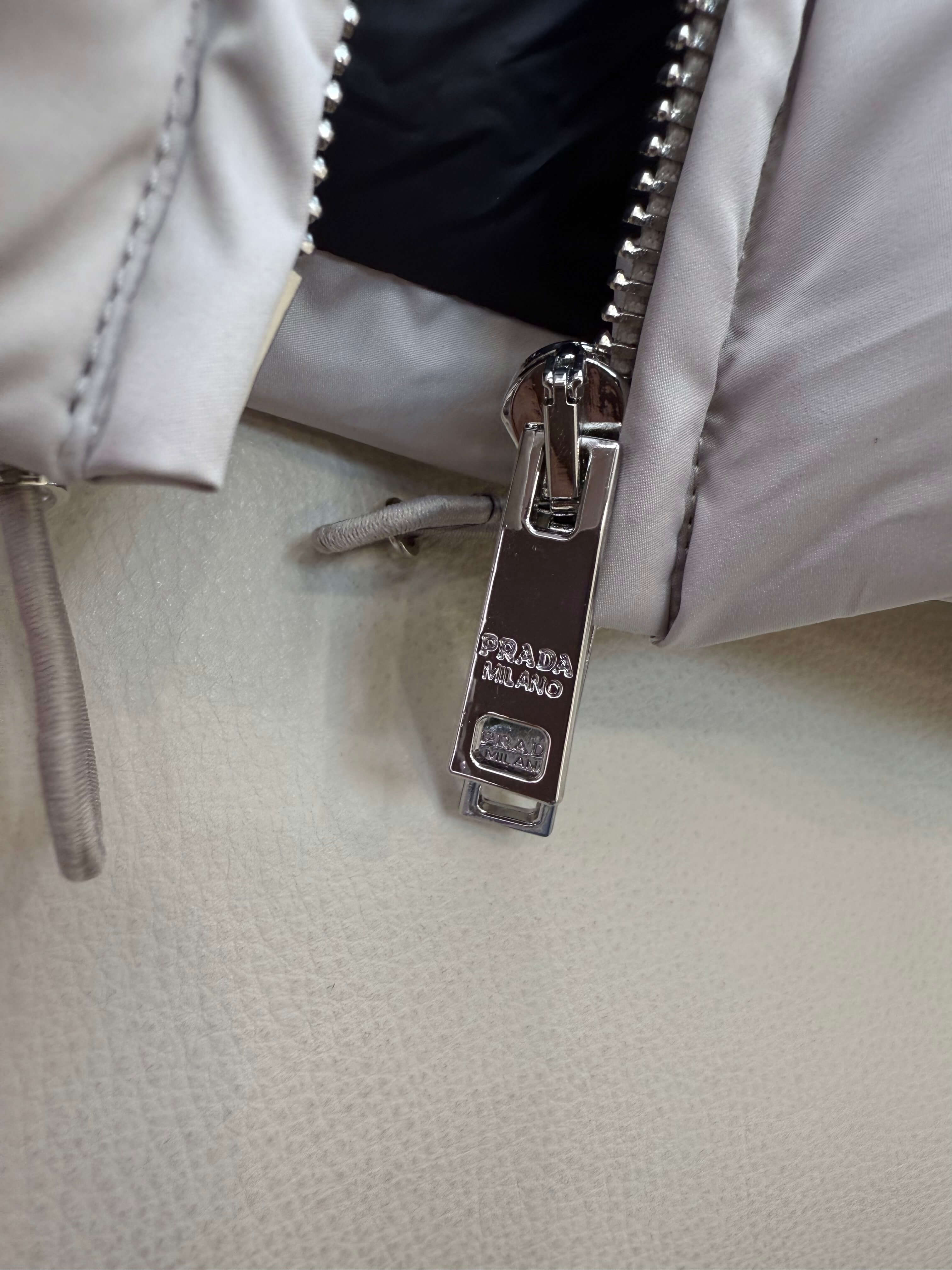 Elevate your winter wardrobe with the serene elegance of the Prada Belted Puffer Jacket in a chic light gray. This is more than a simple jacket; it’s a statement of refined winter style. The light gray color is fresh and modern, a beautiful departure from traditional dark outerwear. Its plush, down-filled material feels luxurious and provides essential warmth on the coldest days. The jacket’s design thoughtfully balances a cozy, puffer feel with a sophisticated, tailored look, thanks to the included belt that creates a flattering and defined silhouette.