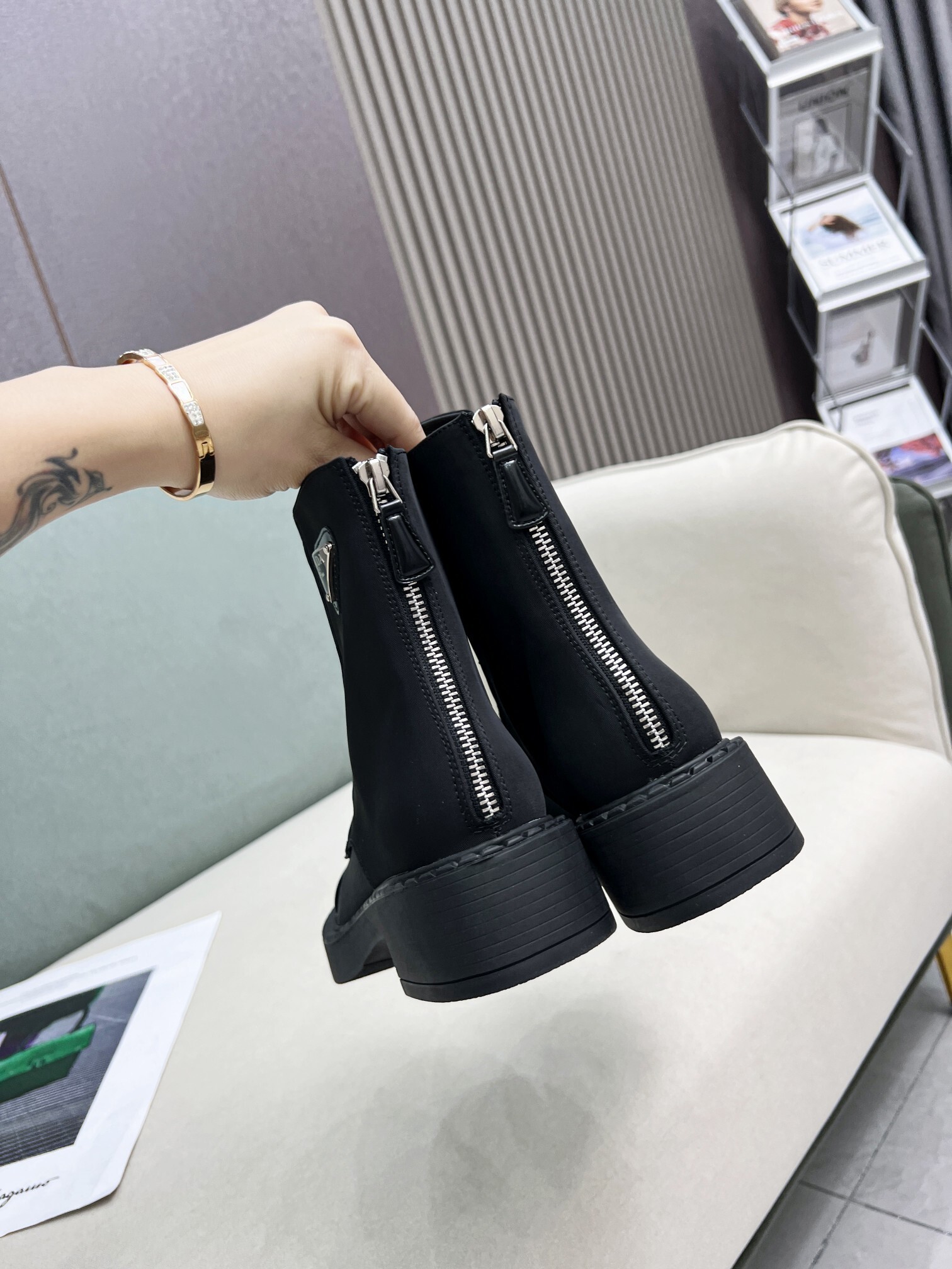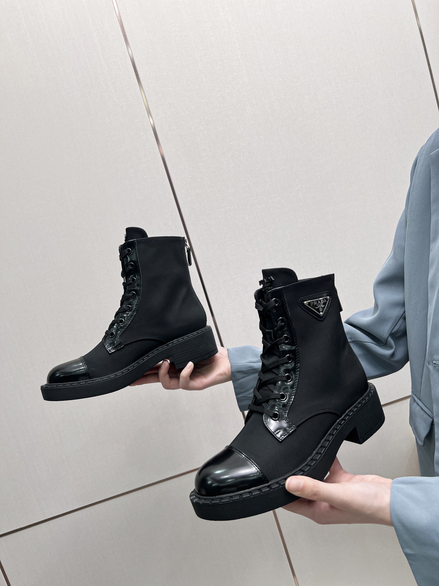 The Prada Black Nylon & Patent Leather Lace-Up Combat Boots deliver a modern, high-fashion take on a utilitarian classic. Crafted with a sleek combination of matte nylon and glossy patent leather, this pair merges durability with refined elegance. The polished cap-toe detail adds a sophisticated edge, while the iconic Prada enamel triangle logo on the side brings unmistakable designer character.