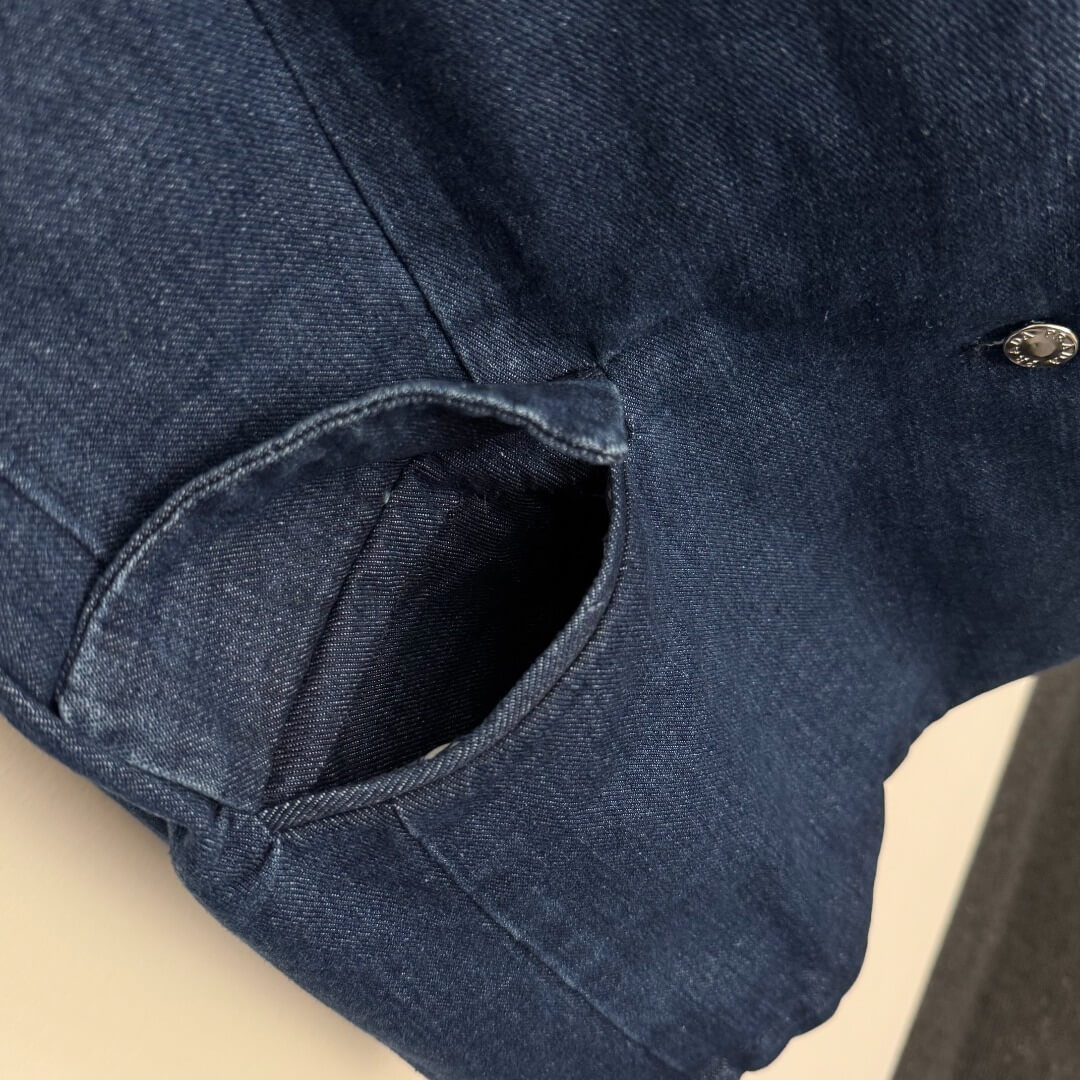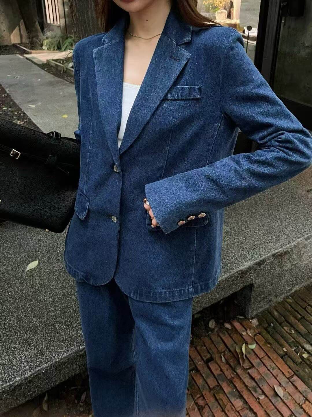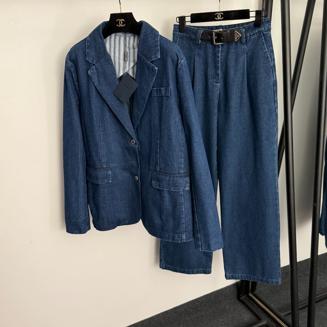 This impeccably coordinated set pairs a long-sleeved denim blazer with high-waisted straight-leg pants, offering a harmonious balance of structure, texture, and refinement. The blazer features a beautifully tailored lapel, thoughtfully placed pockets, and a charming striped lining that adds subtle depth when worn open. The matching trousers are designed with a sleek high waist and accented by a signature triangle leather buckle belt, adding a touch of iconic flair. Together, the pieces form a versatile ensemble that transitions seamlessly from daytime chic to understated evening elegance, while also working beautifully as separates.