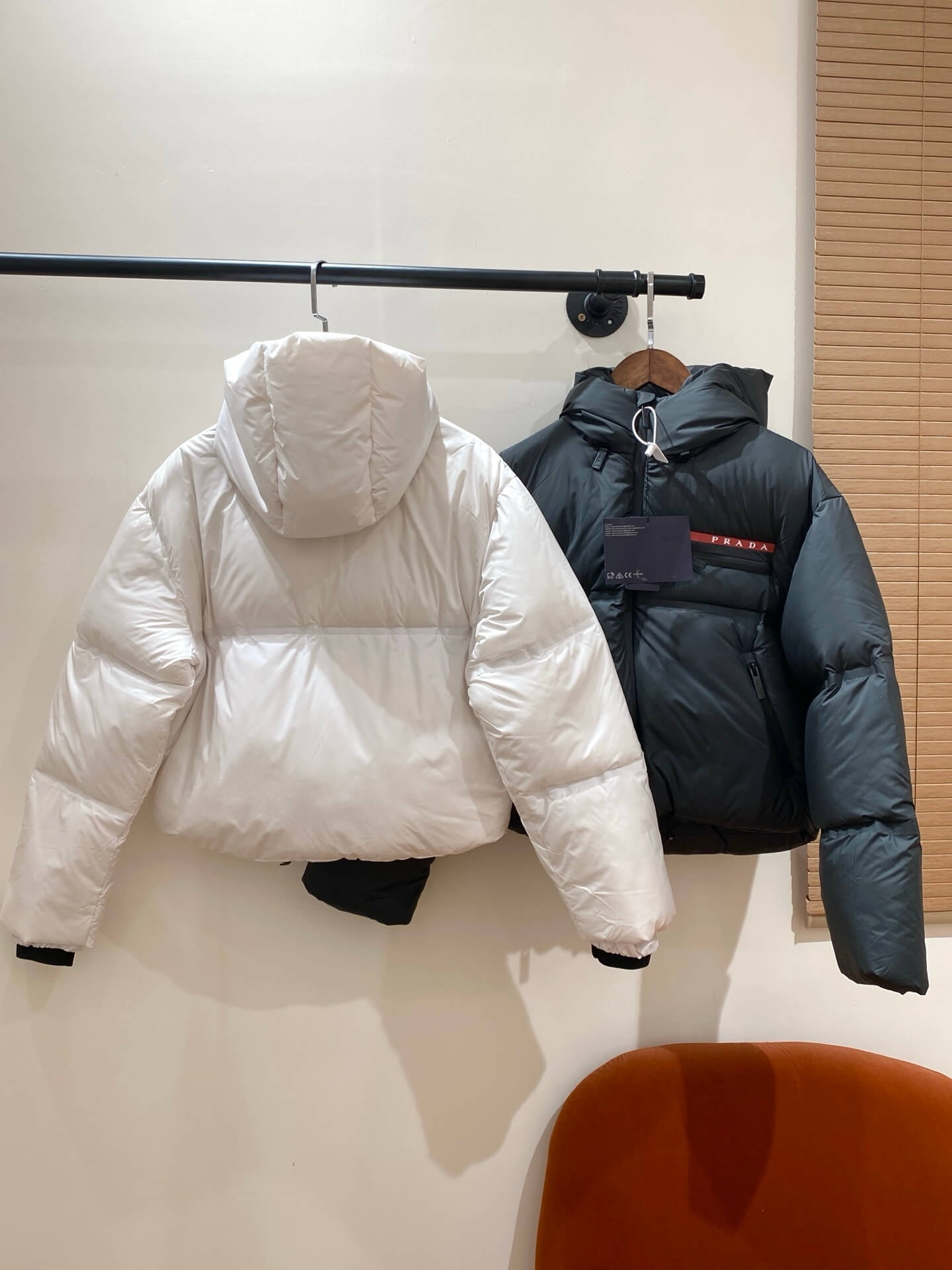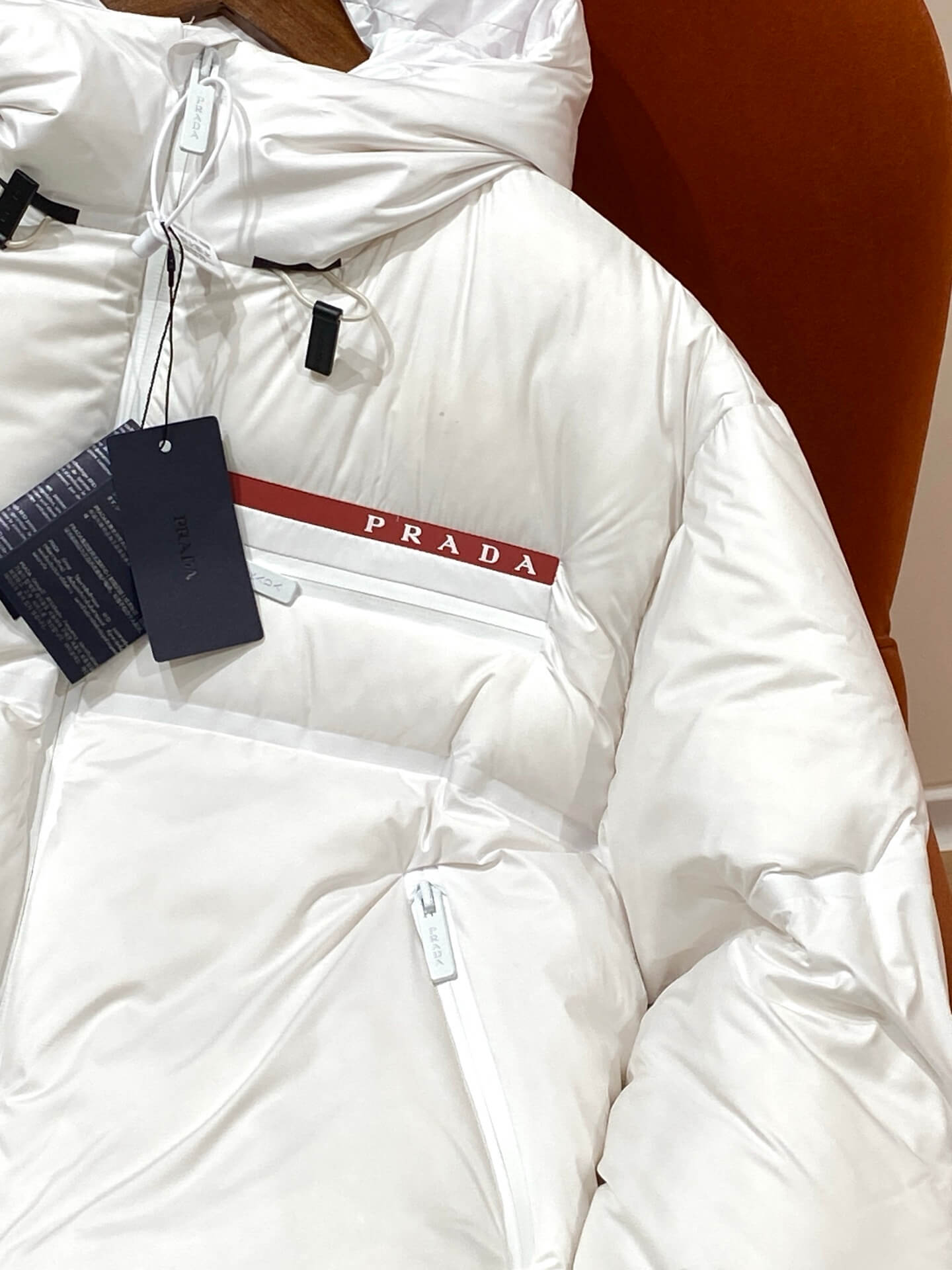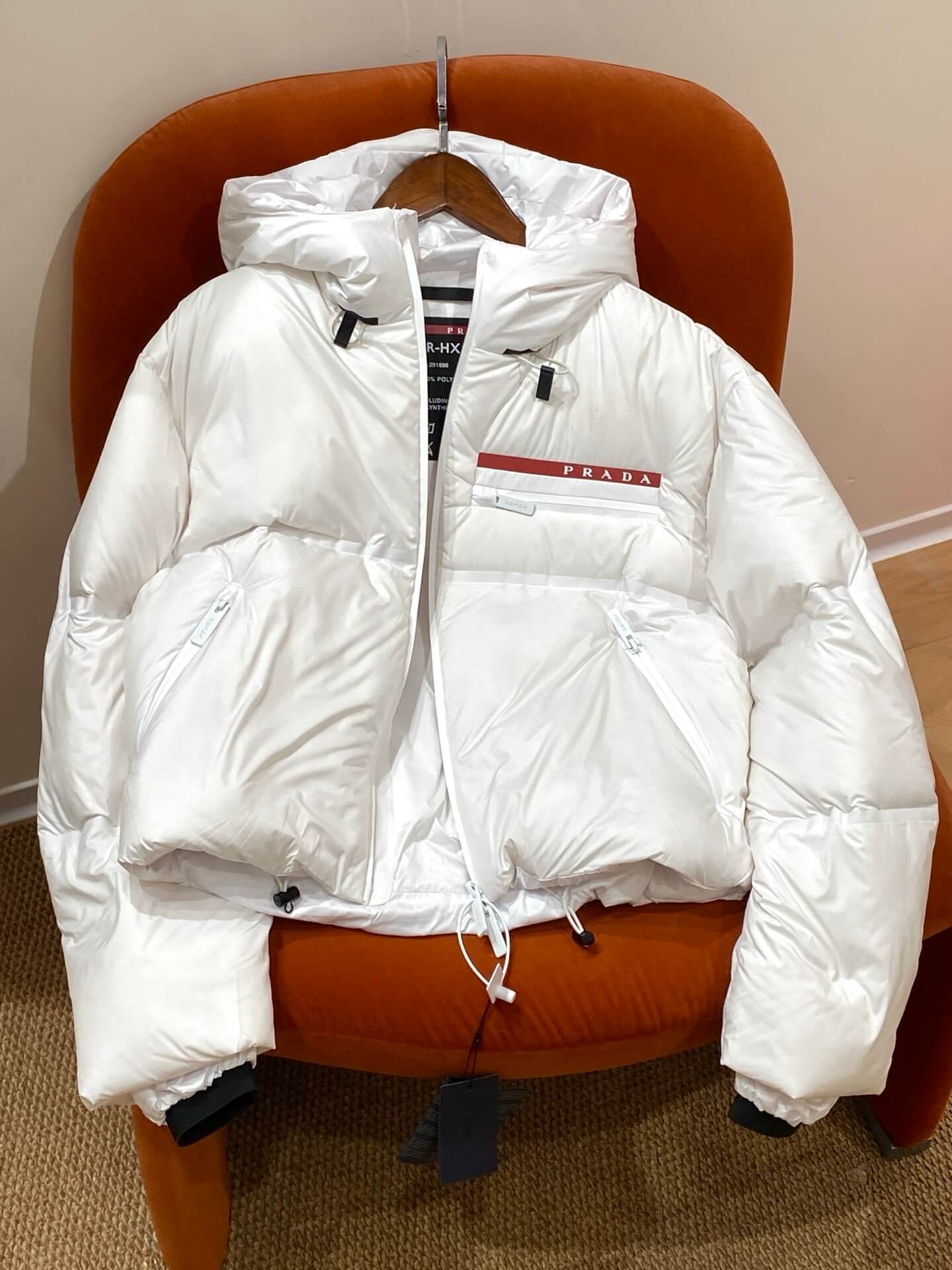 Signature Prada Chest Branding — Instantly recognizable luxury detail that enhances the jacket’s designer appeal.