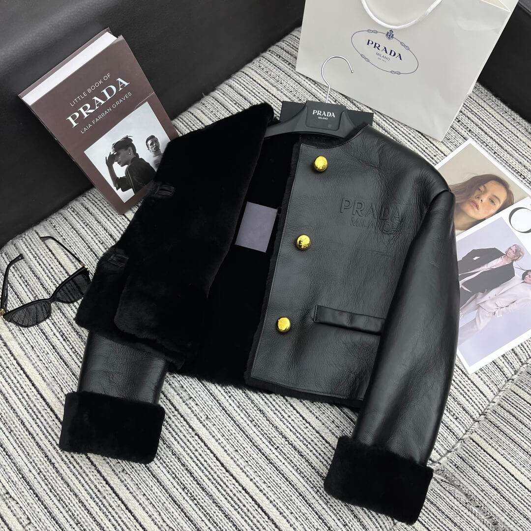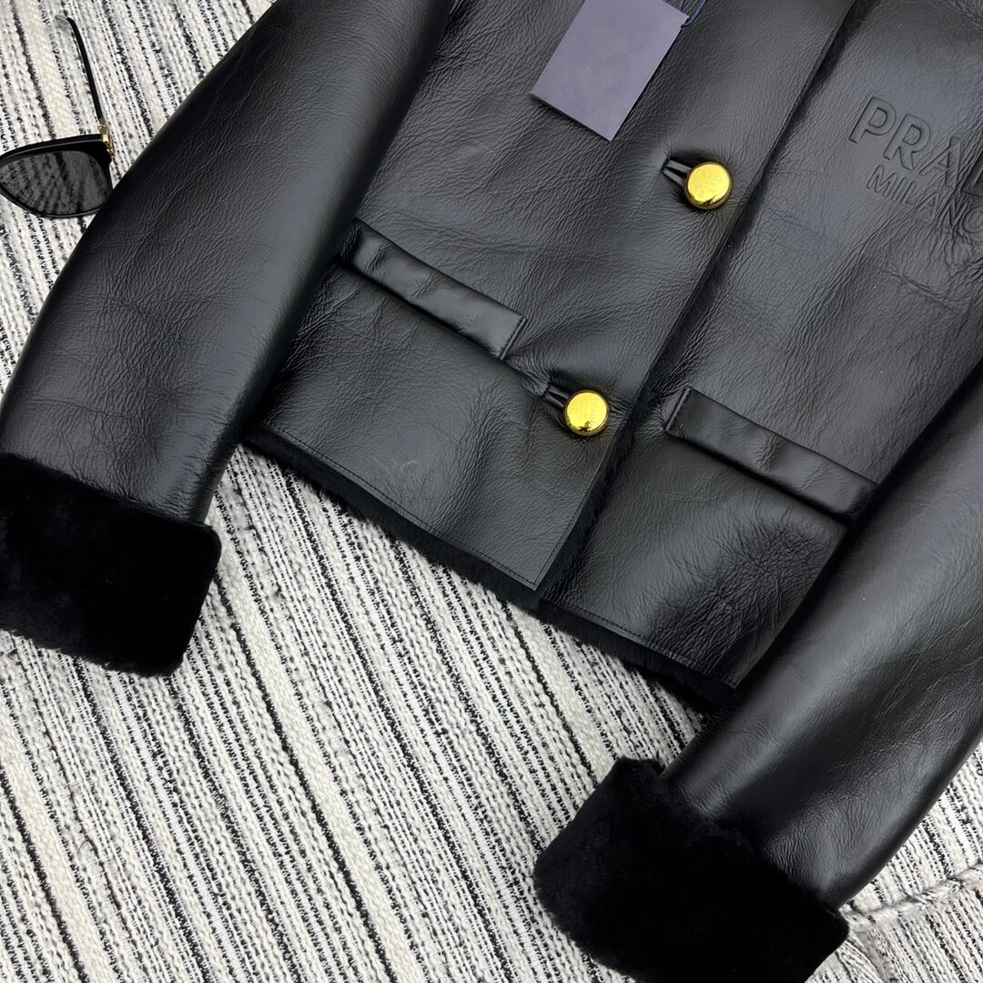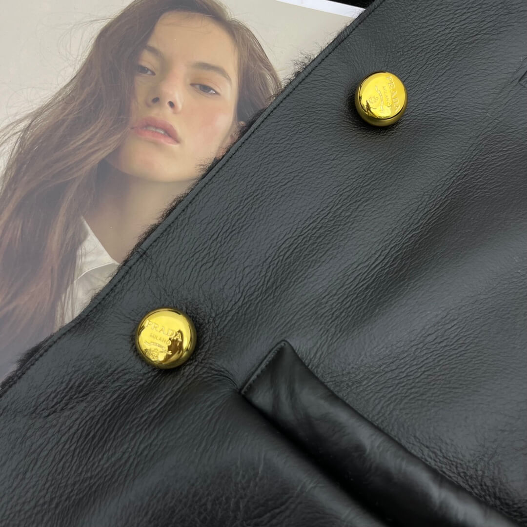 - Details: Gold-tone Prada buttons, structured lapel-free design, and shearling-trimmed cuffs and hem