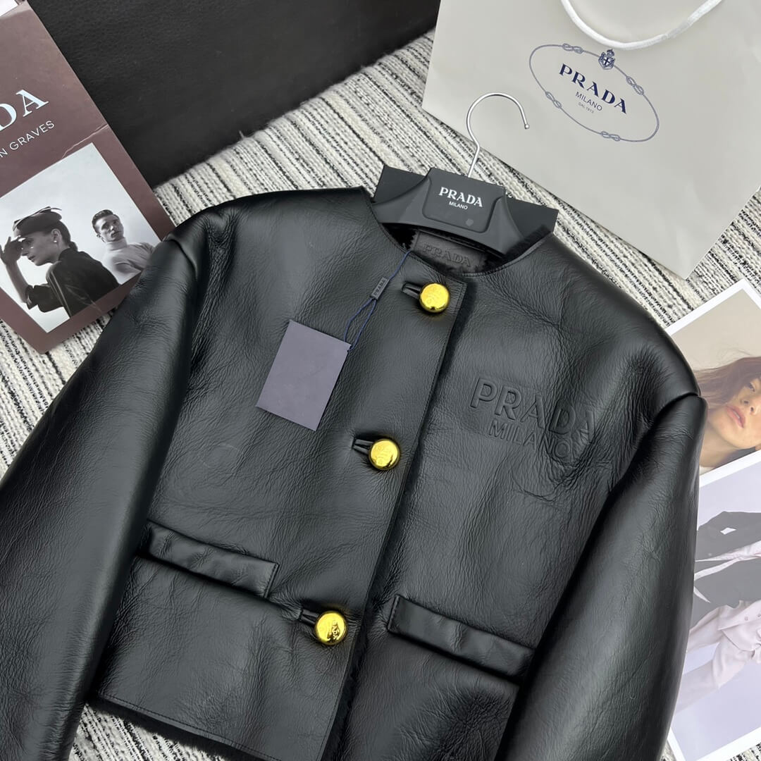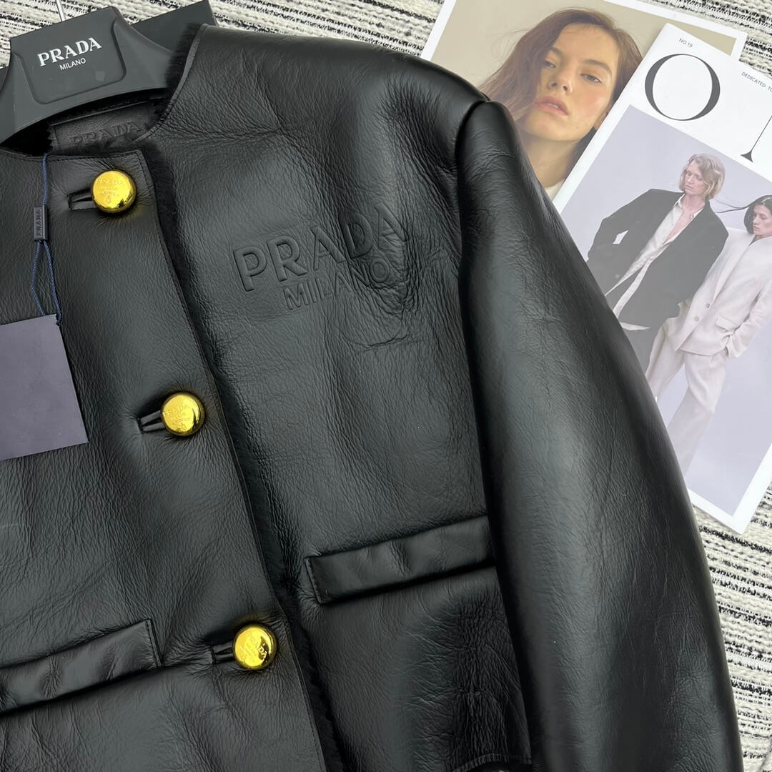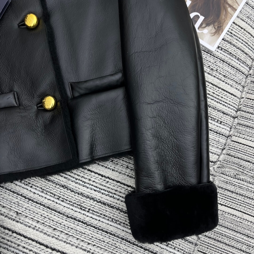 - Details: Gold-tone Prada buttons, structured lapel-free design, and shearling-trimmed cuffs and hem