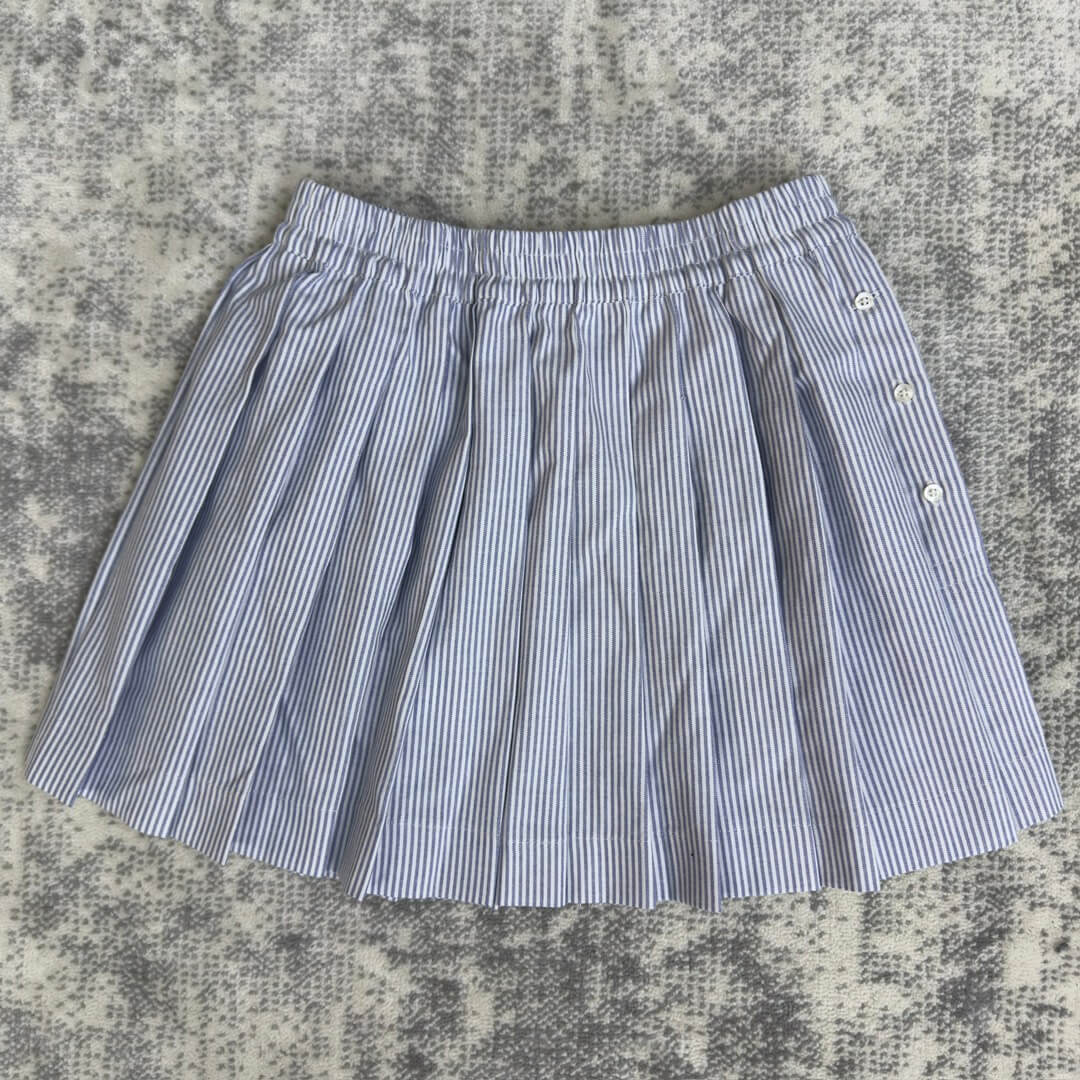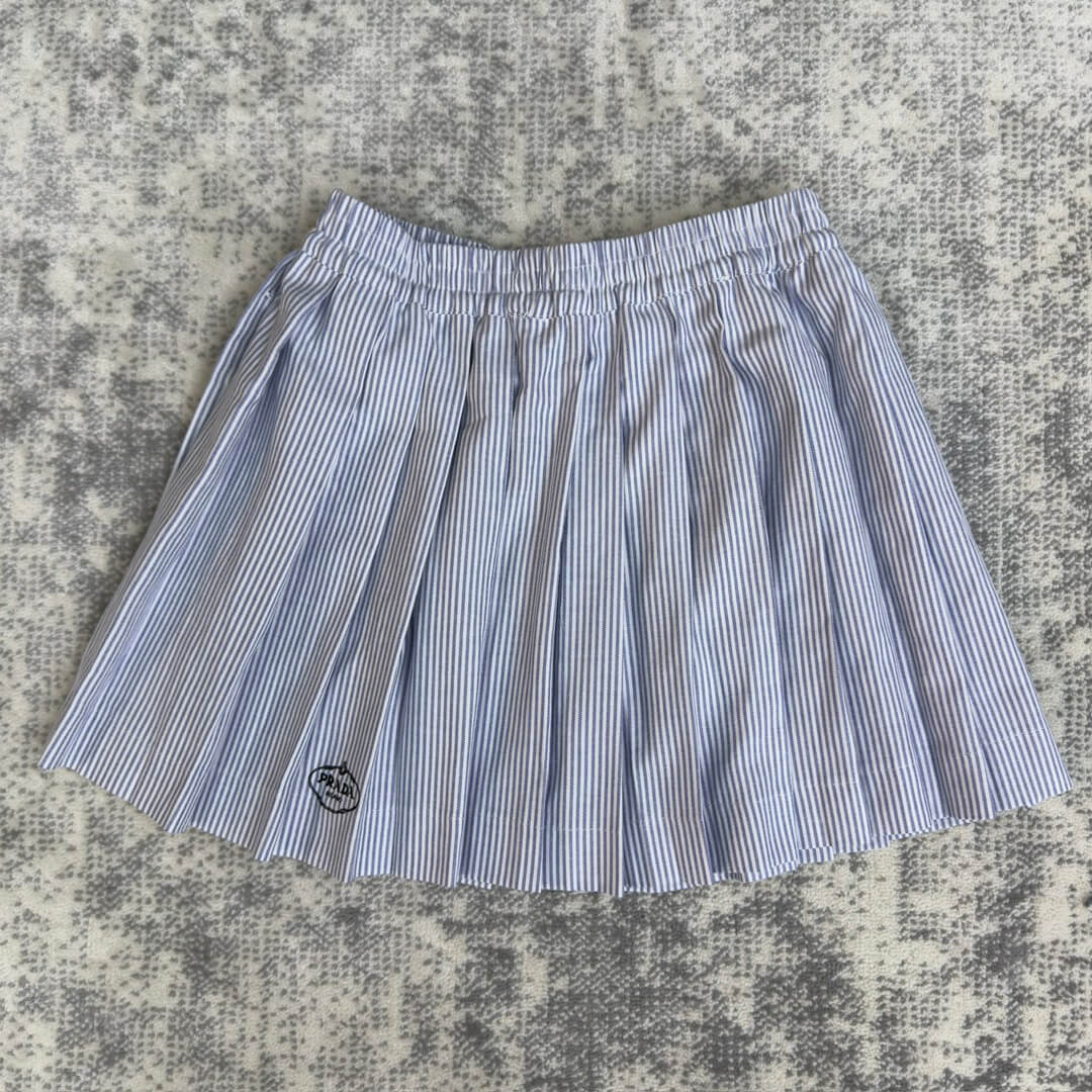 Adorn yourself in playful elegance with this delightful blue and white striped pleated miniskirt from Prada. The crisp stripes and charming pleats create a flattering silhouette, while the subtle Prada logo embroidery adds a touch of signature style. Perfect for the sunny days of spring and summer, this miniskirt is a lovely addition to any wardrobe, offering a fresh and feminine appeal.