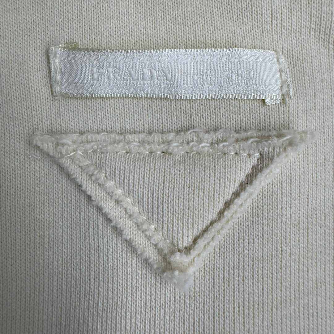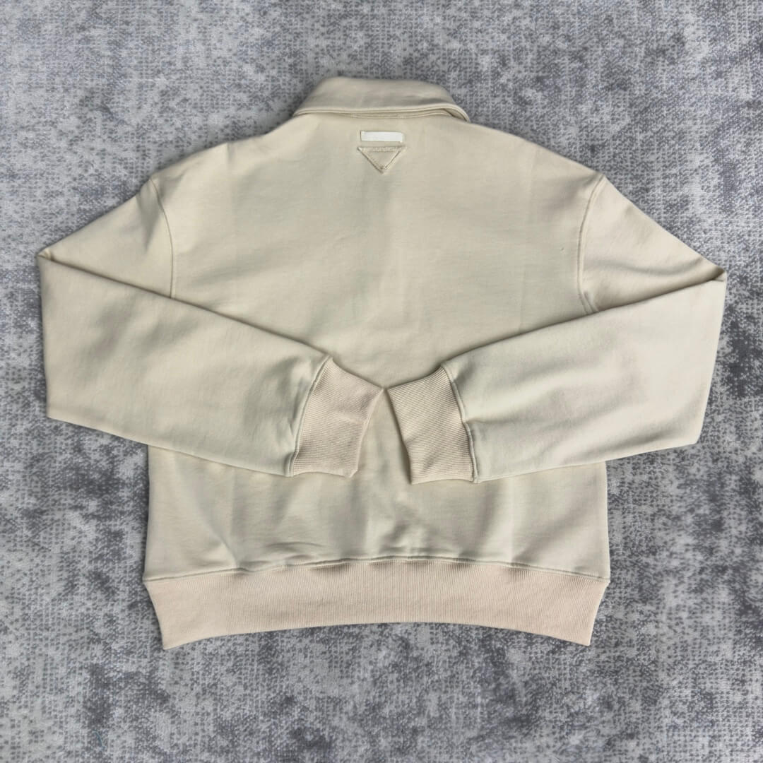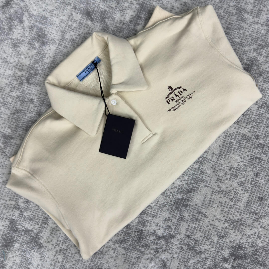 Indulge in understated elegance with this cream-colored Prada logo-print cotton fleece polo shirt. The plush fleece material offers exceptional comfort, while the iconic Prada logo subtly elevates the design. Its versatile style makes it ideal for layering during the cooler months of autumn and winter, or for adding a touch of sophistication to breezy spring days.