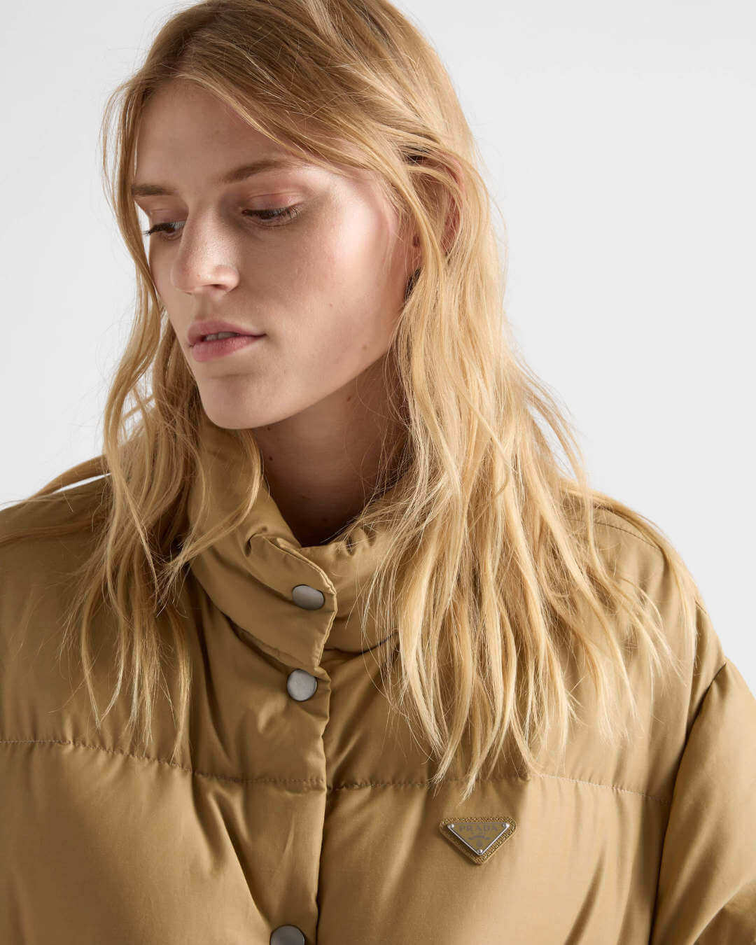 The Prada Medium-weight Technical Fabric Down Jacket in light beige perfectly captures the brand’s minimalist, pragmatic approach to luxury. The beige hue is a sophisticated alternative to traditional black, offering a soft yet structured look. The jacket’s design focuses on utility, featuring a sleek stand collar and two pronounced snap-closure flap pockets, reminiscent of classic field jackets. The down insulation provides essential warmth, while the un-quilted exterior surface maintains a clean, refined silhouette, only subtly accented by the metallic snaps and the signature triangle logo.