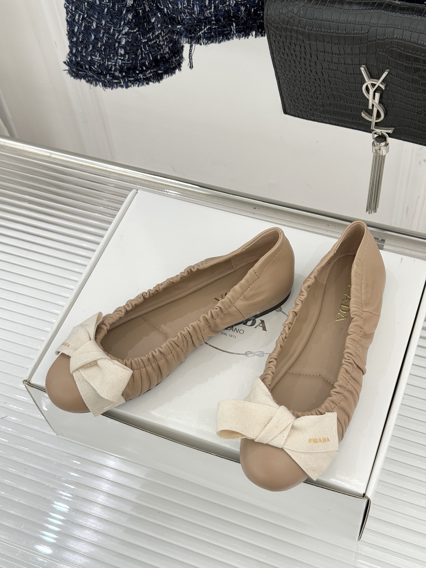 Features: Ruched elastic sides, signature fabric bow with Prada logo detail, cushioned leather insole
