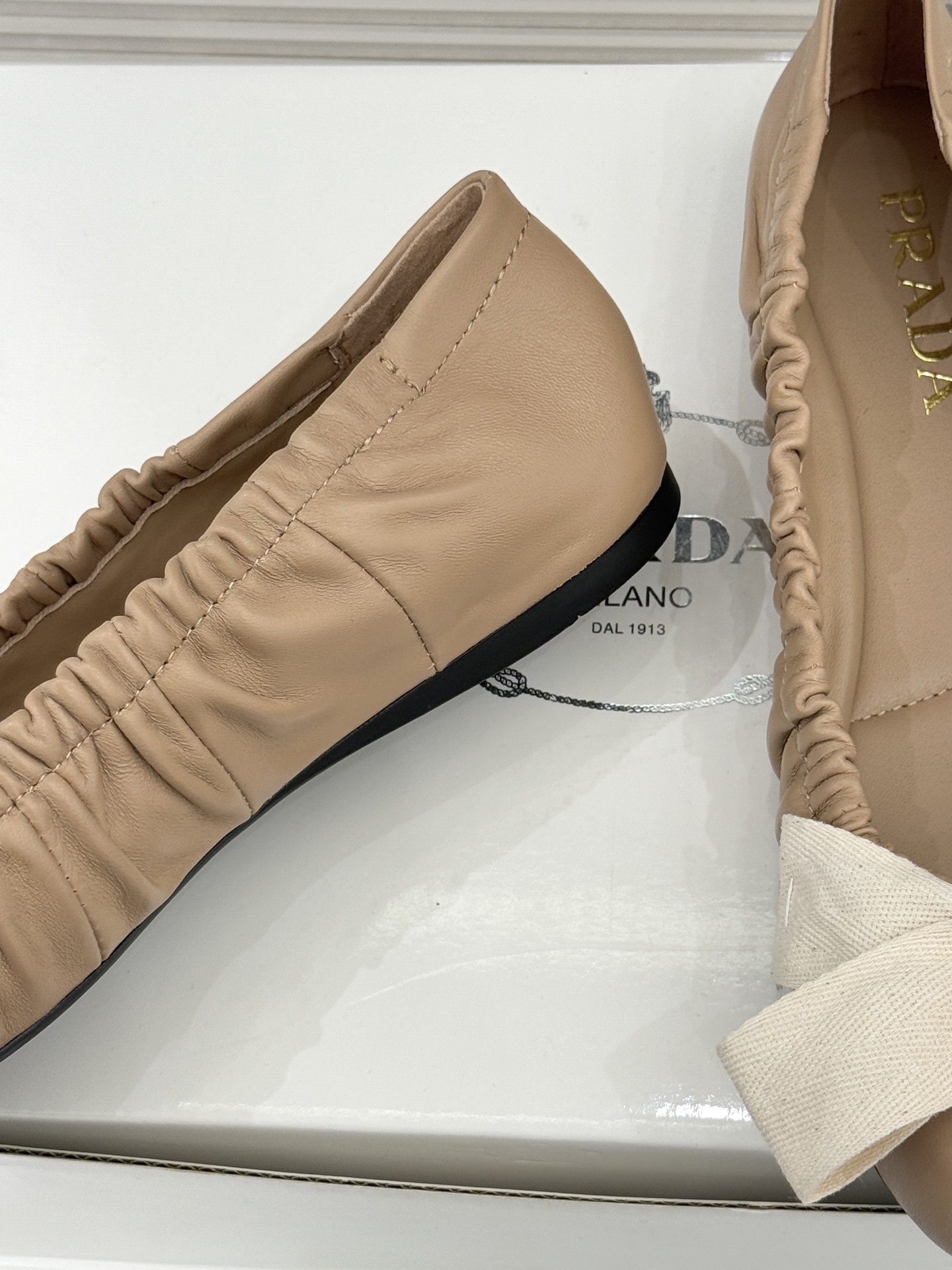 The Prada Nude Leather Bow Ballet Flats embody effortless sophistication with a soft, feminine appeal. Crafted in supple nude leather, this elegant silhouette features delicate ruched detailing along the sides, creating a flexible, glove-like fit that enhances comfort while maintaining a refined finish.