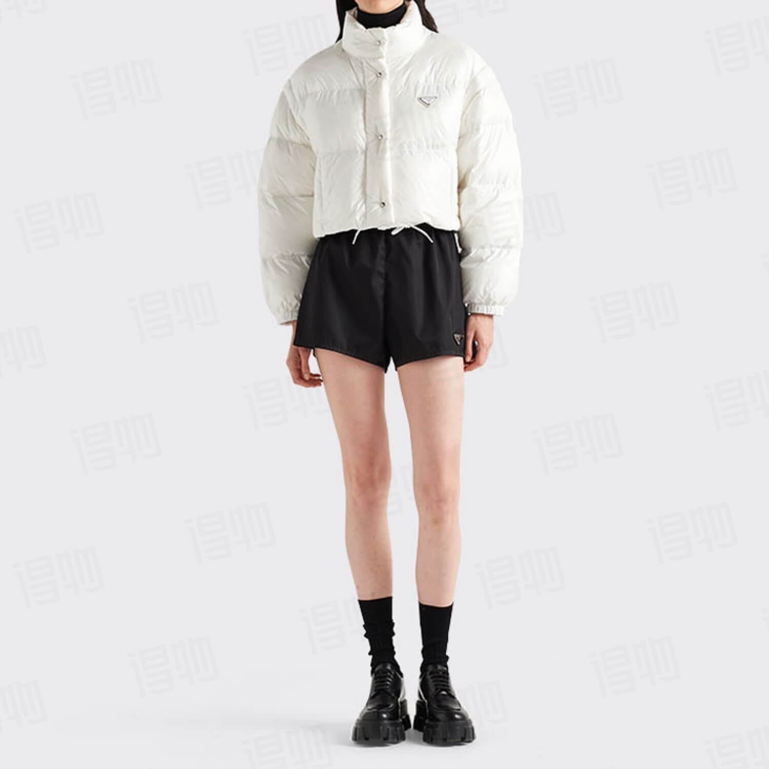As the winter air bites, embrace the stylish warmth of the Prada Re-Nylon Cropped Down Jacketin Offwhite. This isn’t just an item of clothing; it’s a testament to chic comfort, perfect for navigating the colder months with an air of effortless sophistication. Crafted from Prada’s innovative Re-Nylon, a durable and silky-smooth material, this jacket in a soft ecru hue offers a fresh, clean aesthetic that brightens up any winter ensemble. The plush down filling guarantees a cozy embrace against the chill, making it an indispensable part of your cold-weather wardrobe.