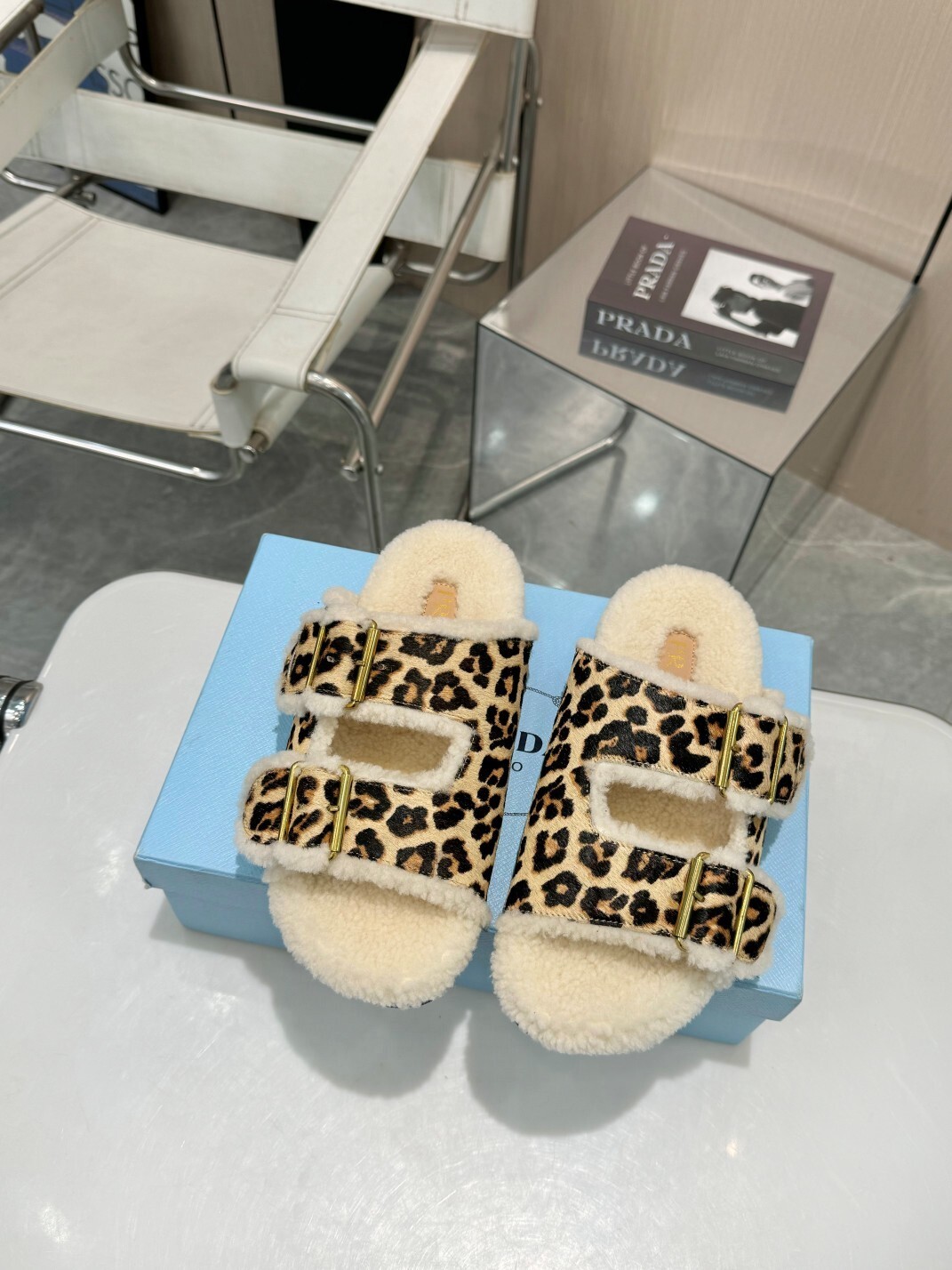 The Prada Shearling Leopard Print Sandals combine bold style with luxurious comfort. Featuring a statement leopard-print calf hair upper accented with plush shearling lining, these sandals bring a touch of wild sophistication to casual wear. Dual adjustable gold-tone buckle straps ensure a secure fit, while the rugged black rubber sole provides durability and everyday practicality.