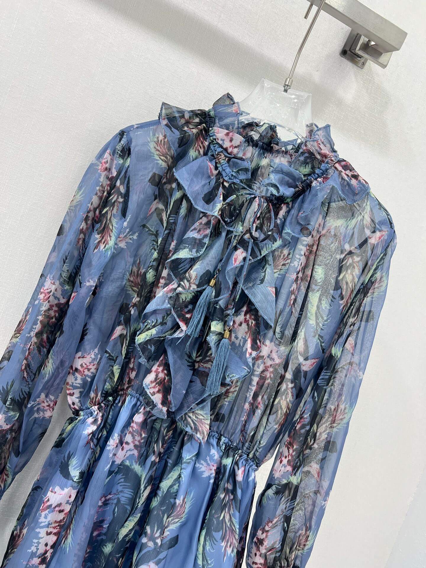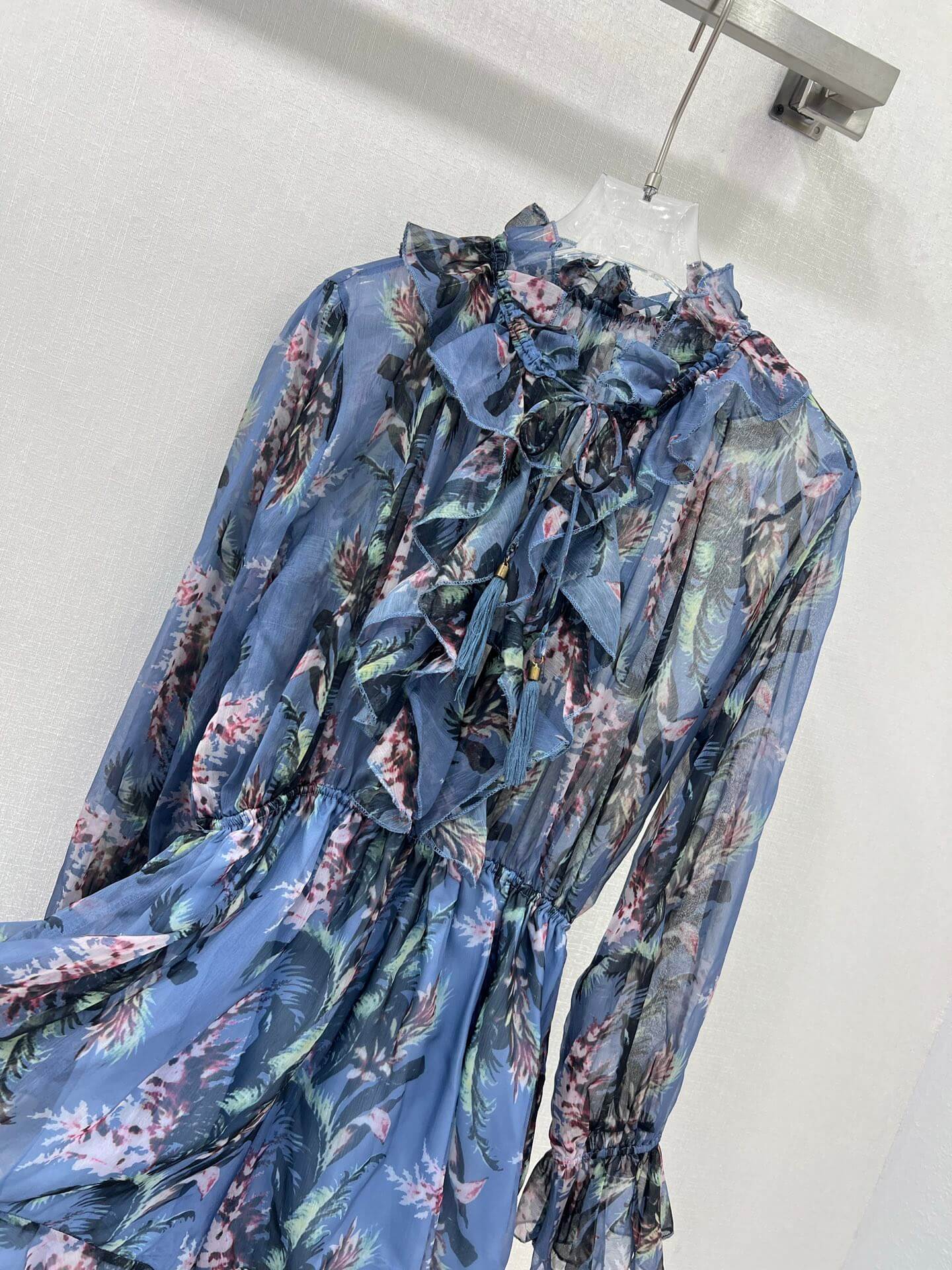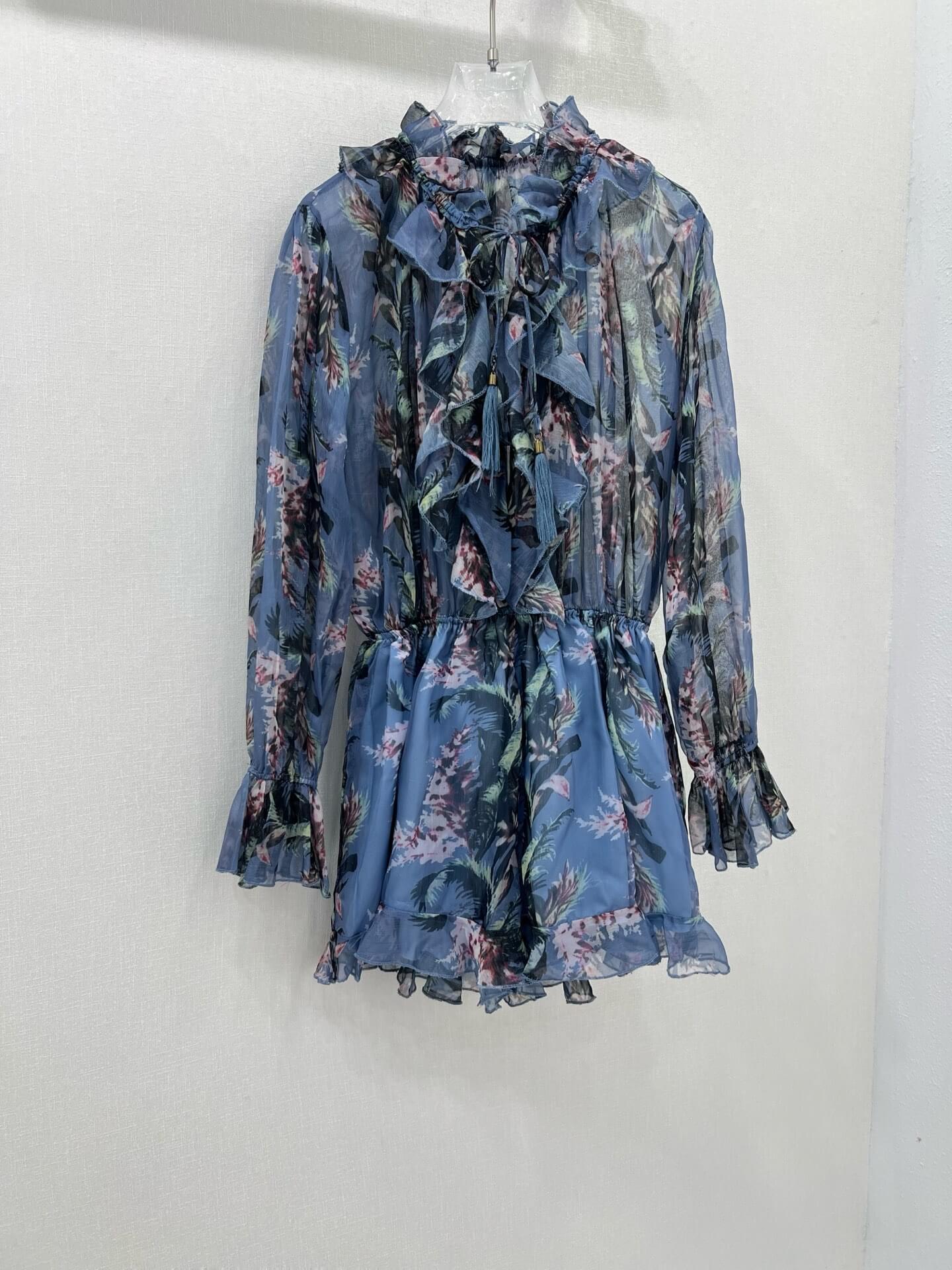 Indulge in whimsical charm with this blue playsuit, adorned with a delicate floral print in shades of green, white, and purple. It features a high ruffled neckline with a tie detail, long sheer sleeves, and a flattering tie waist, all complemented by a playful ruffled hem.