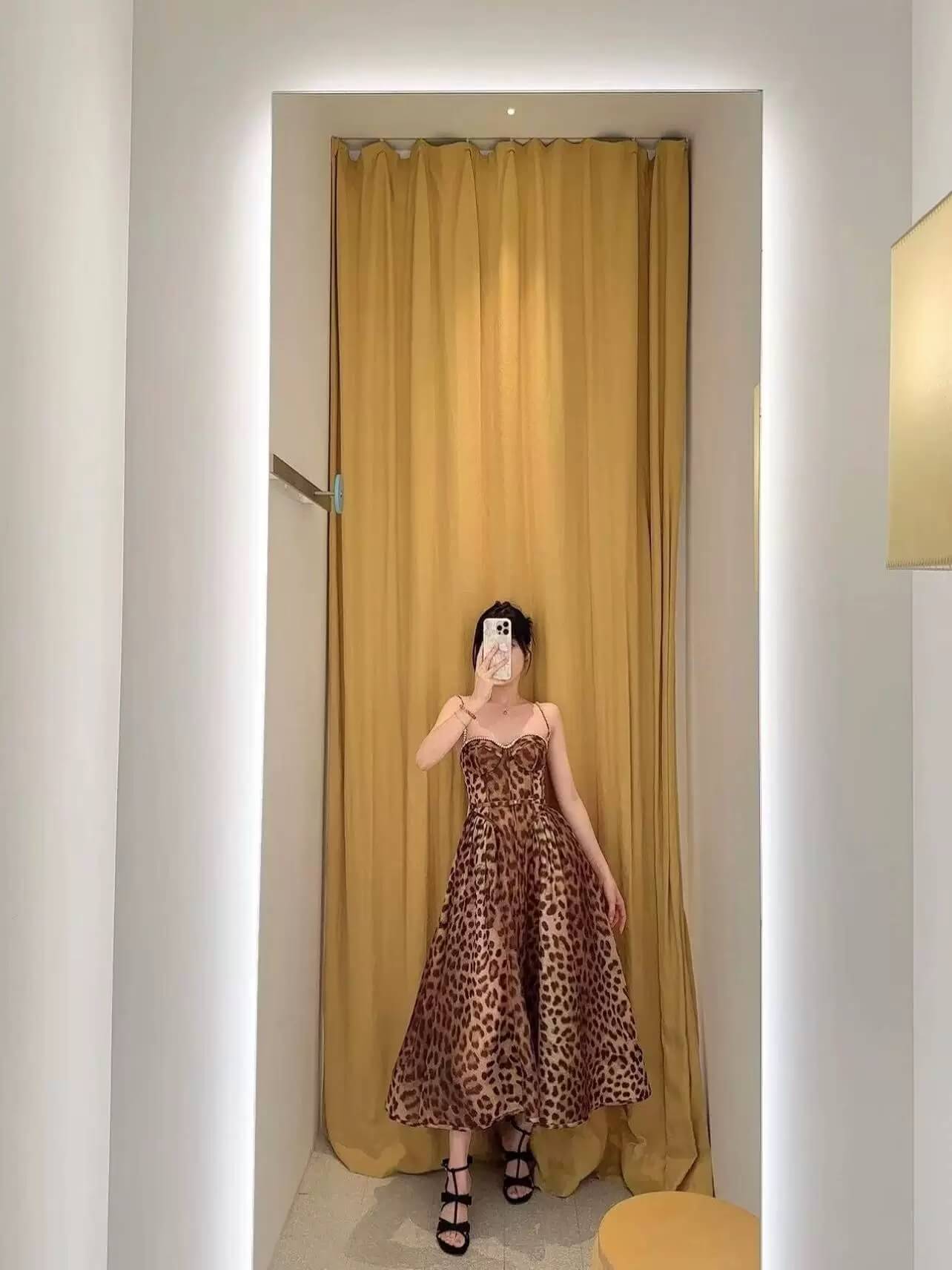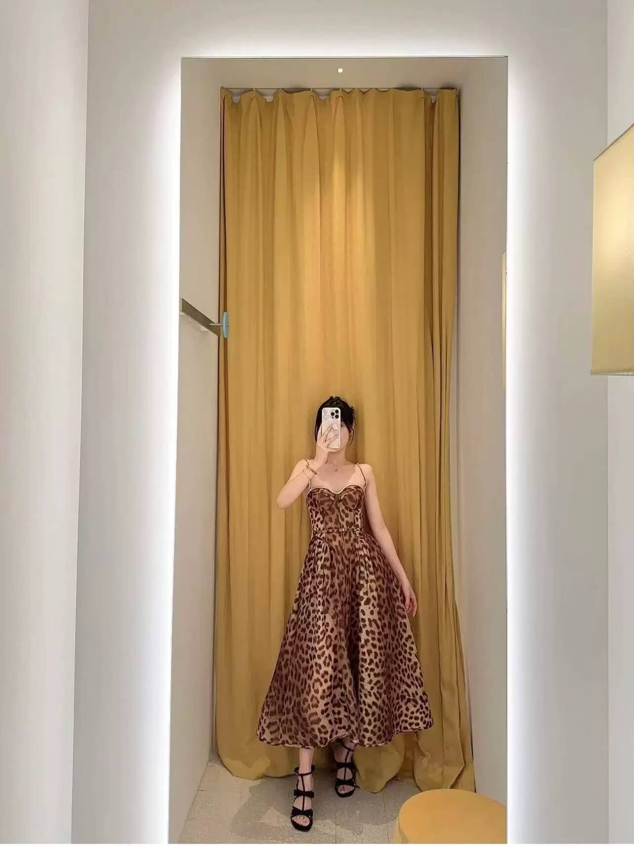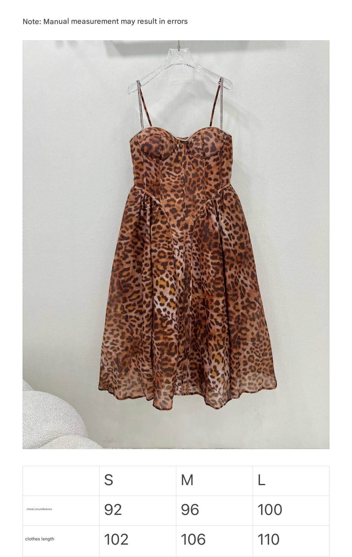 Unleash your wild side with this captivating leopard-print midi dress, designed to turn heads. It features delicate rhinestone-embellished straps, a flattering sweetheart neckline with subtle boning, and a dramatic full skirt, creating a stunning and elegant silhouette.
