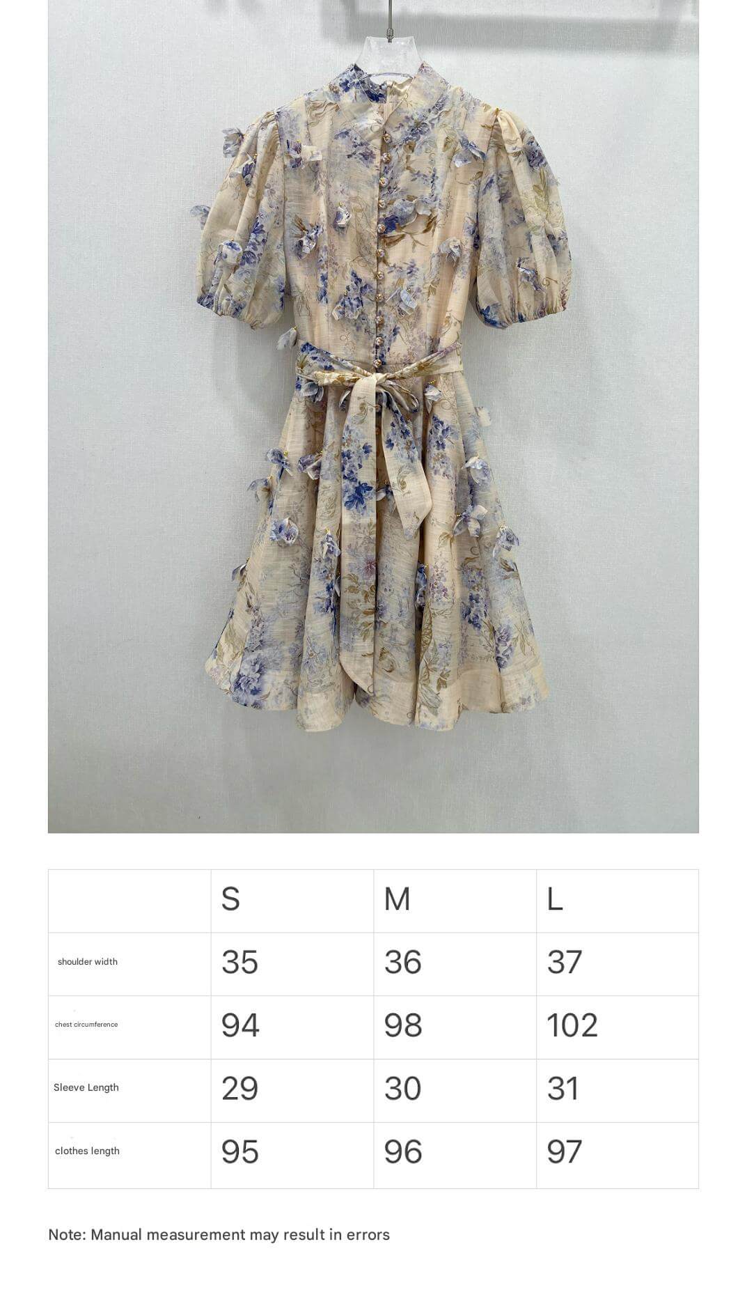 Embrace whimsical elegance with this cream-colored mini dress, adorned with a soft floral print in shades of blue and purple. It features charming puff sleeves, a high neckline, and a flattering self-tie belt, all complemented by subtle 3D floral appliqués for a unique, ethereal touch.