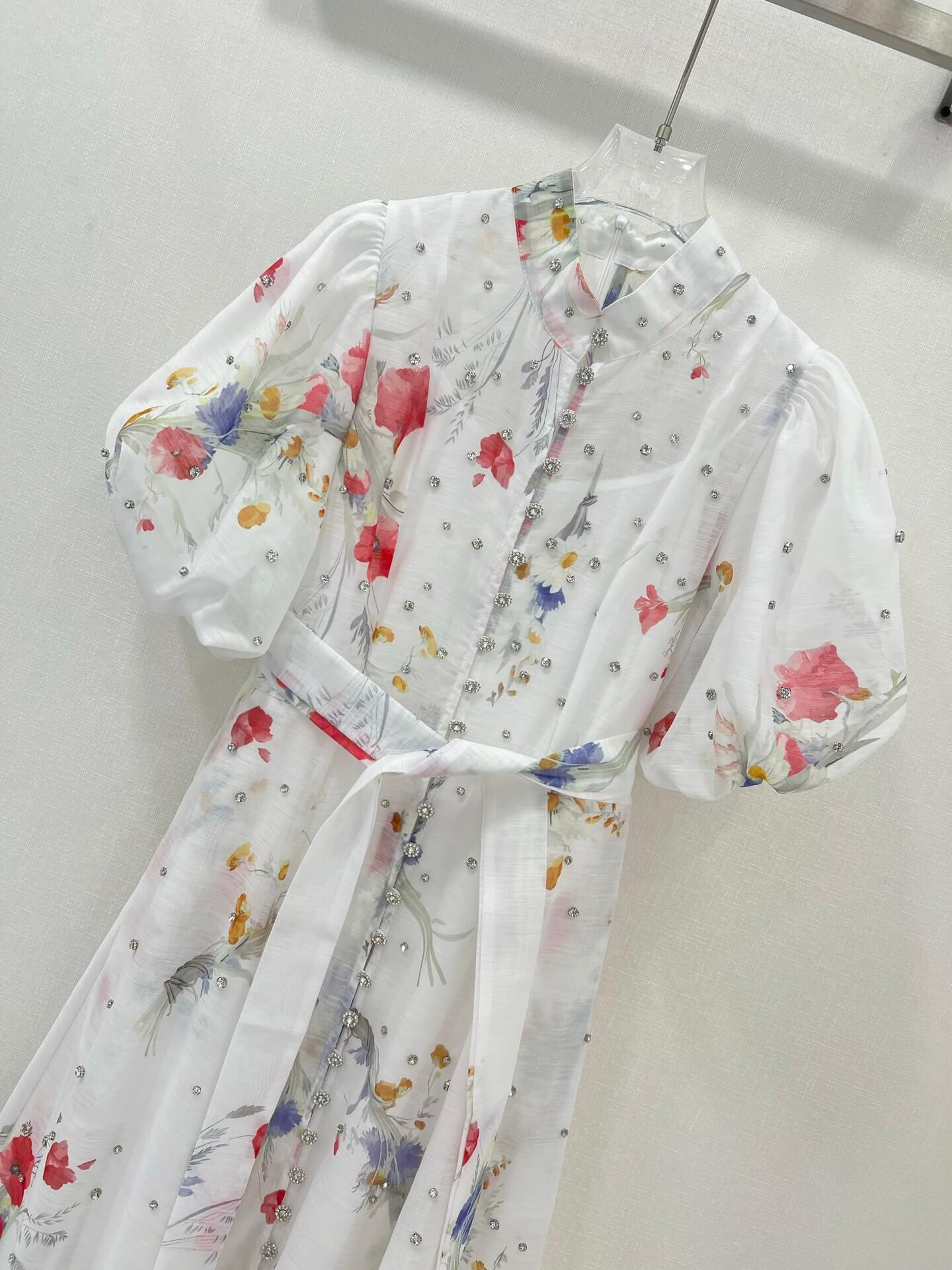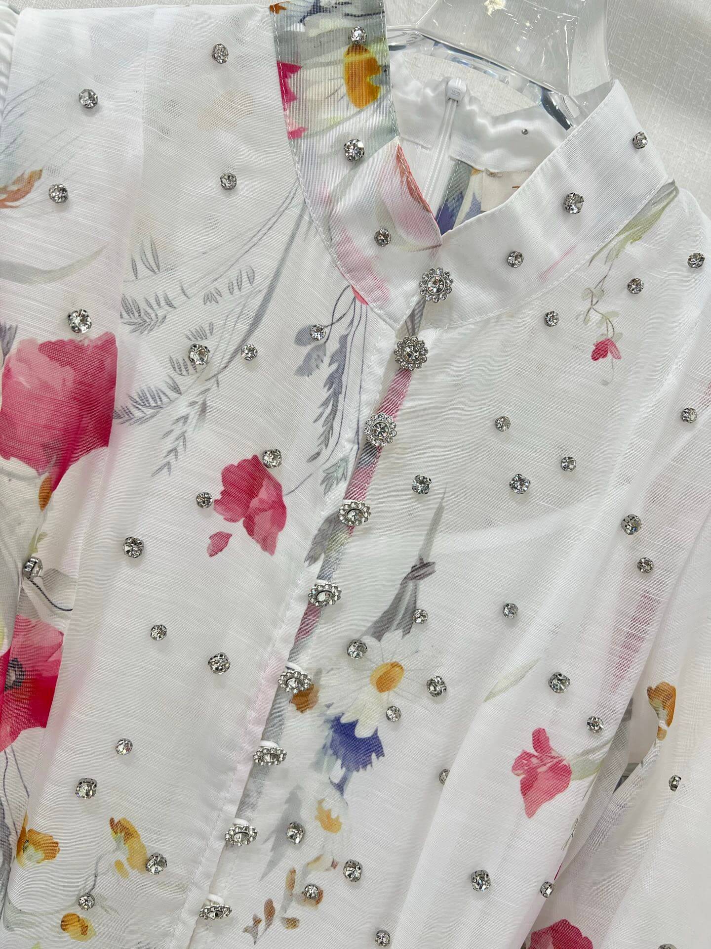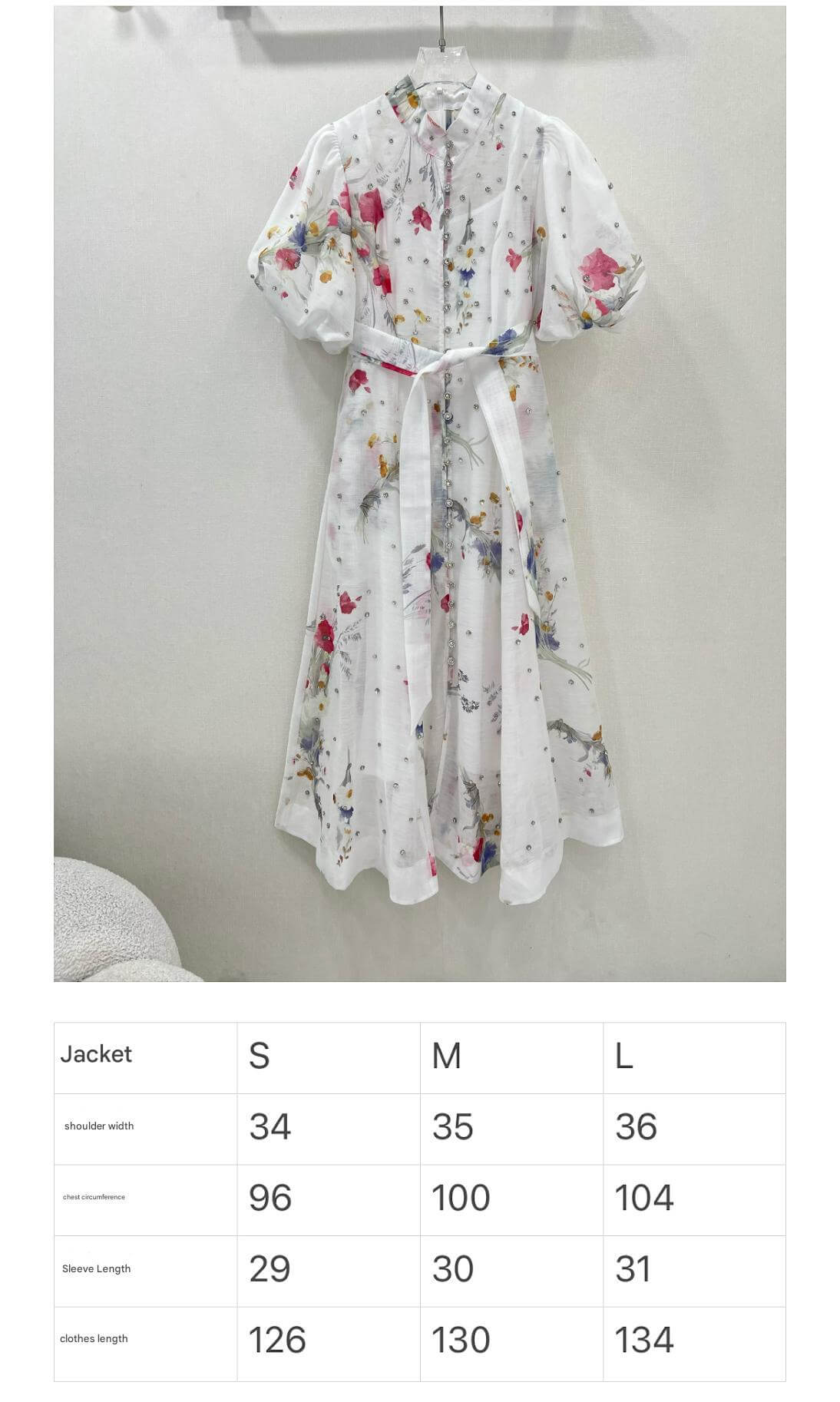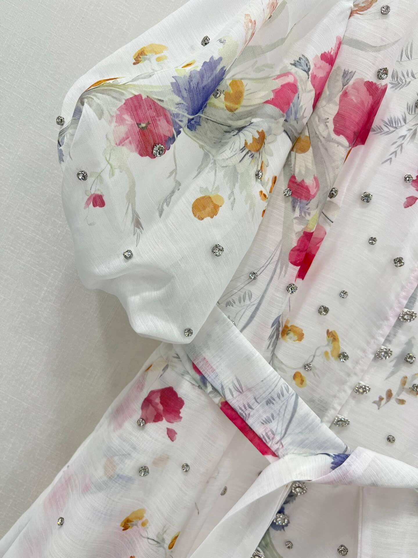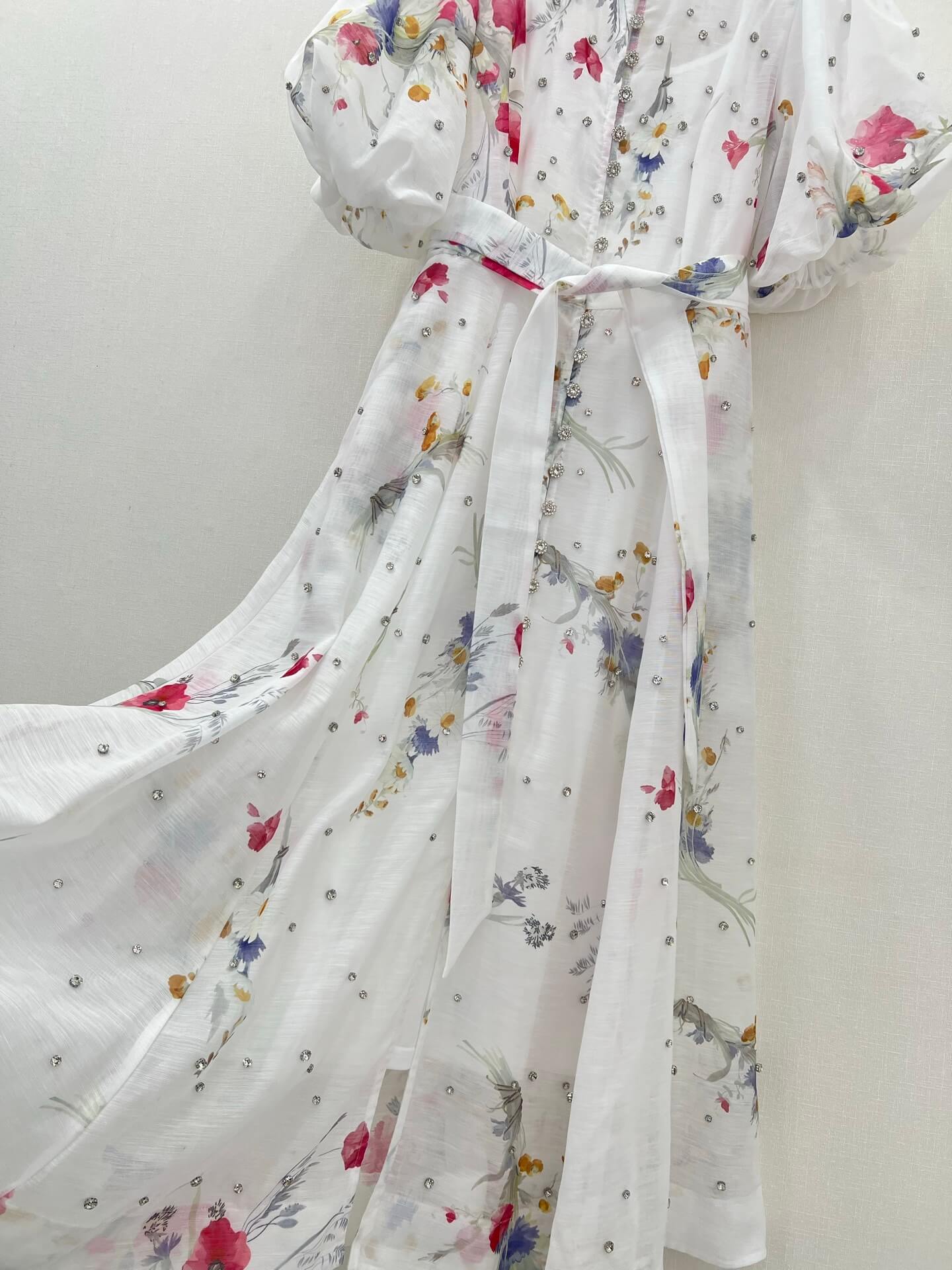 Step into a dream with this enchanting white midi dress, adorned with vibrant floral prints and delicate sparkle embellishments throughout. It features elegant puff sleeves, a sophisticated high collar, a full-button front, and a self-tie belt to cinch the waist, creating a truly romantic silhouette.