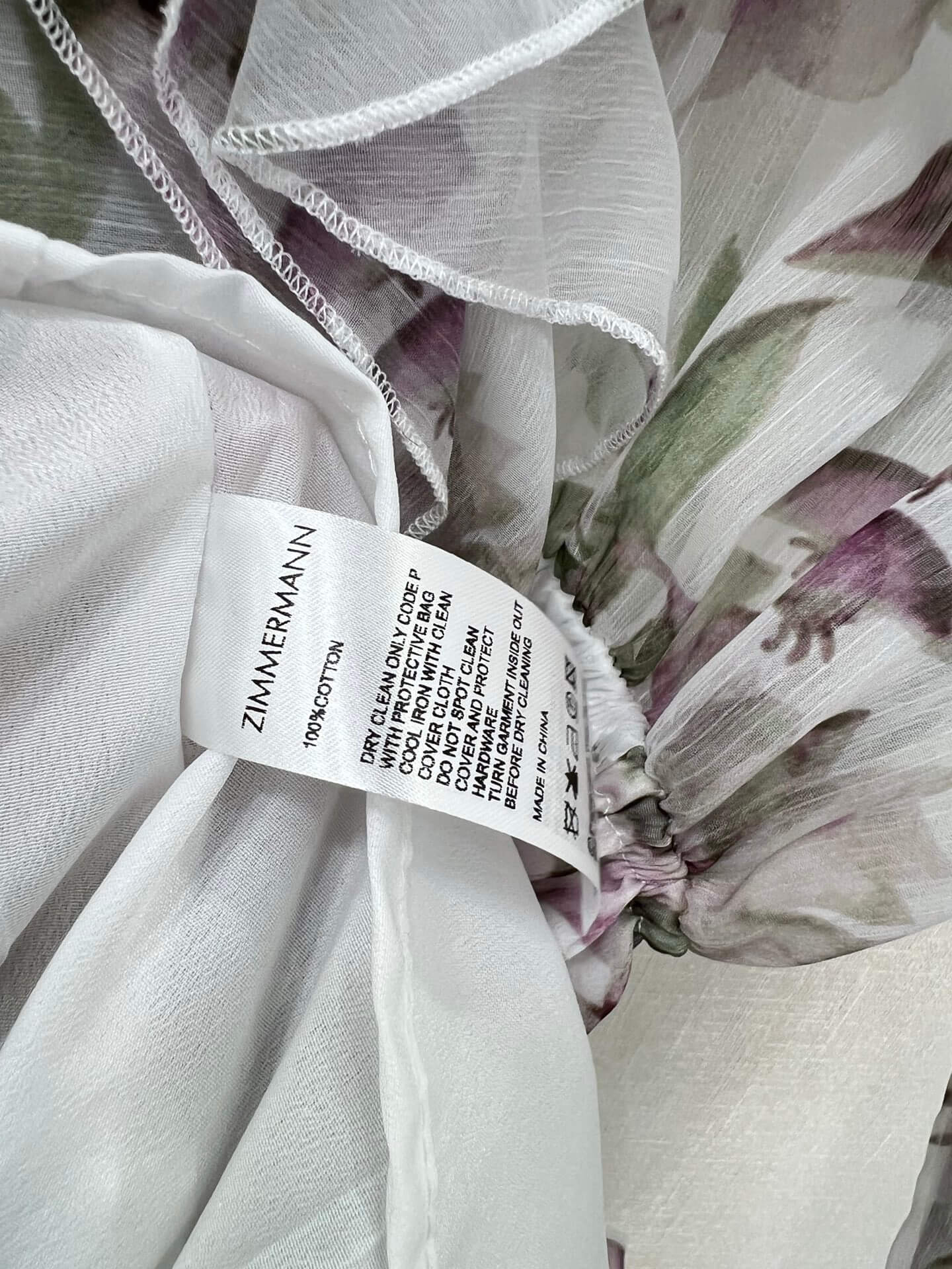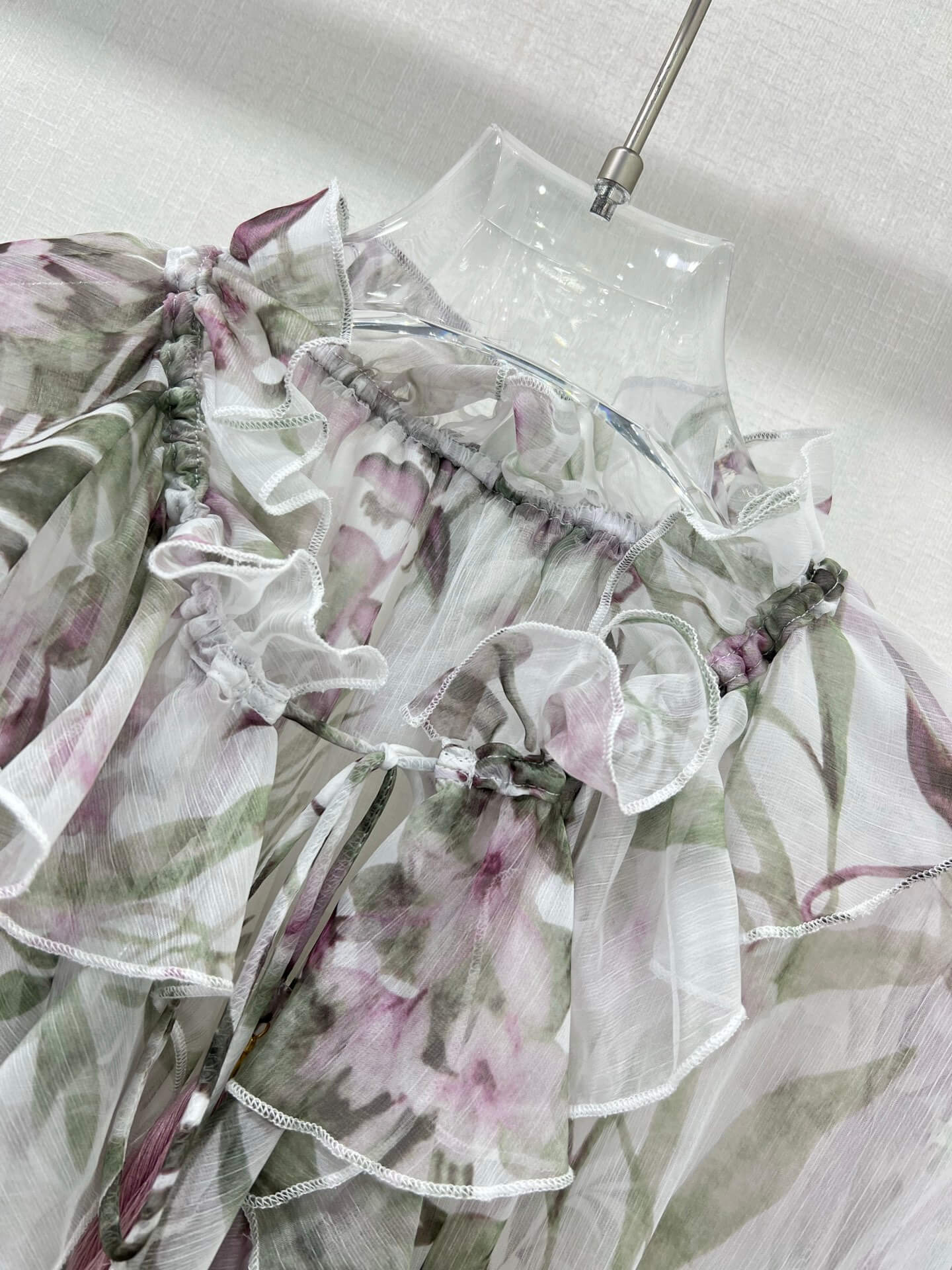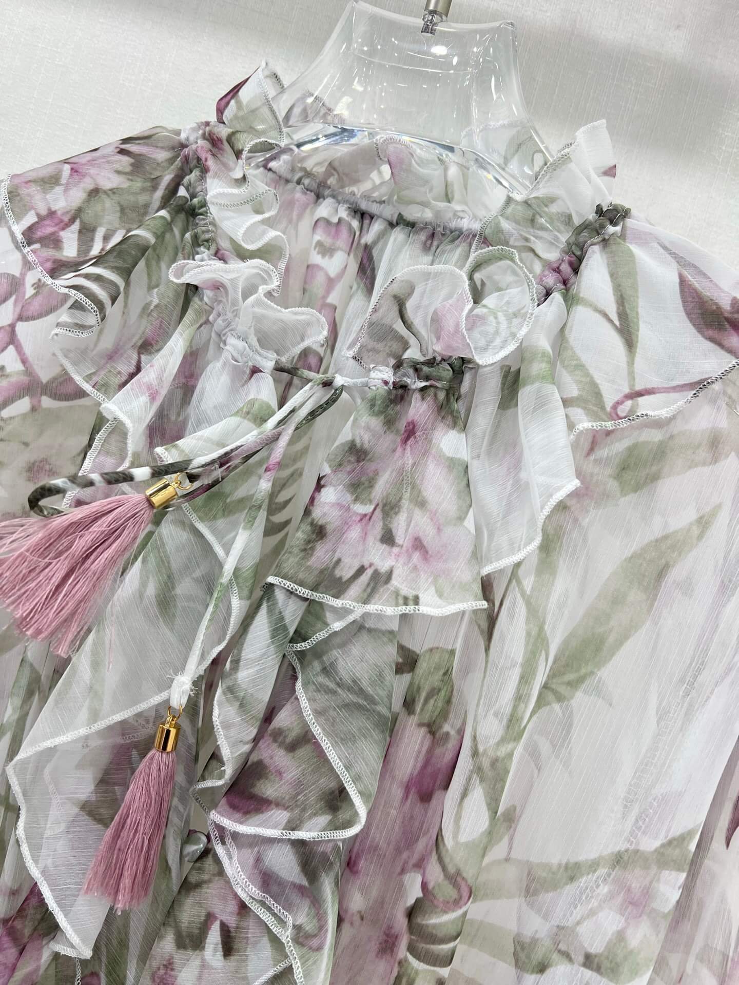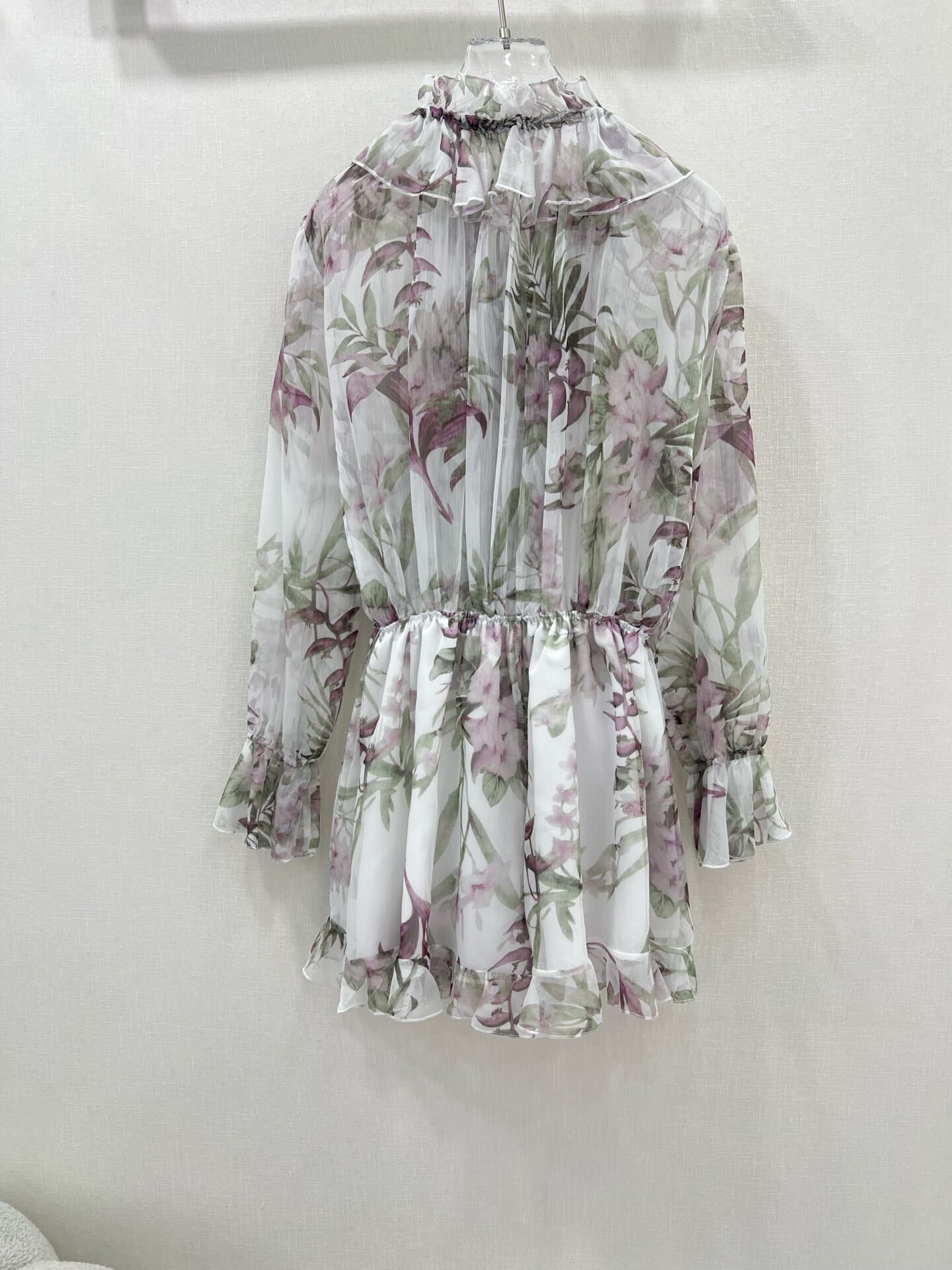 Drift into a dream with this sheer white playsuit, featuring a delicate floral print in shades of purple and green. It boasts a high ruffled neckline with a charming tassel tie, cascading ruffles down the front, long flowing sleeves with ruffled cuffs, and a playful tiered and ruffled hem, creating an ethereal and feminine silhouette.